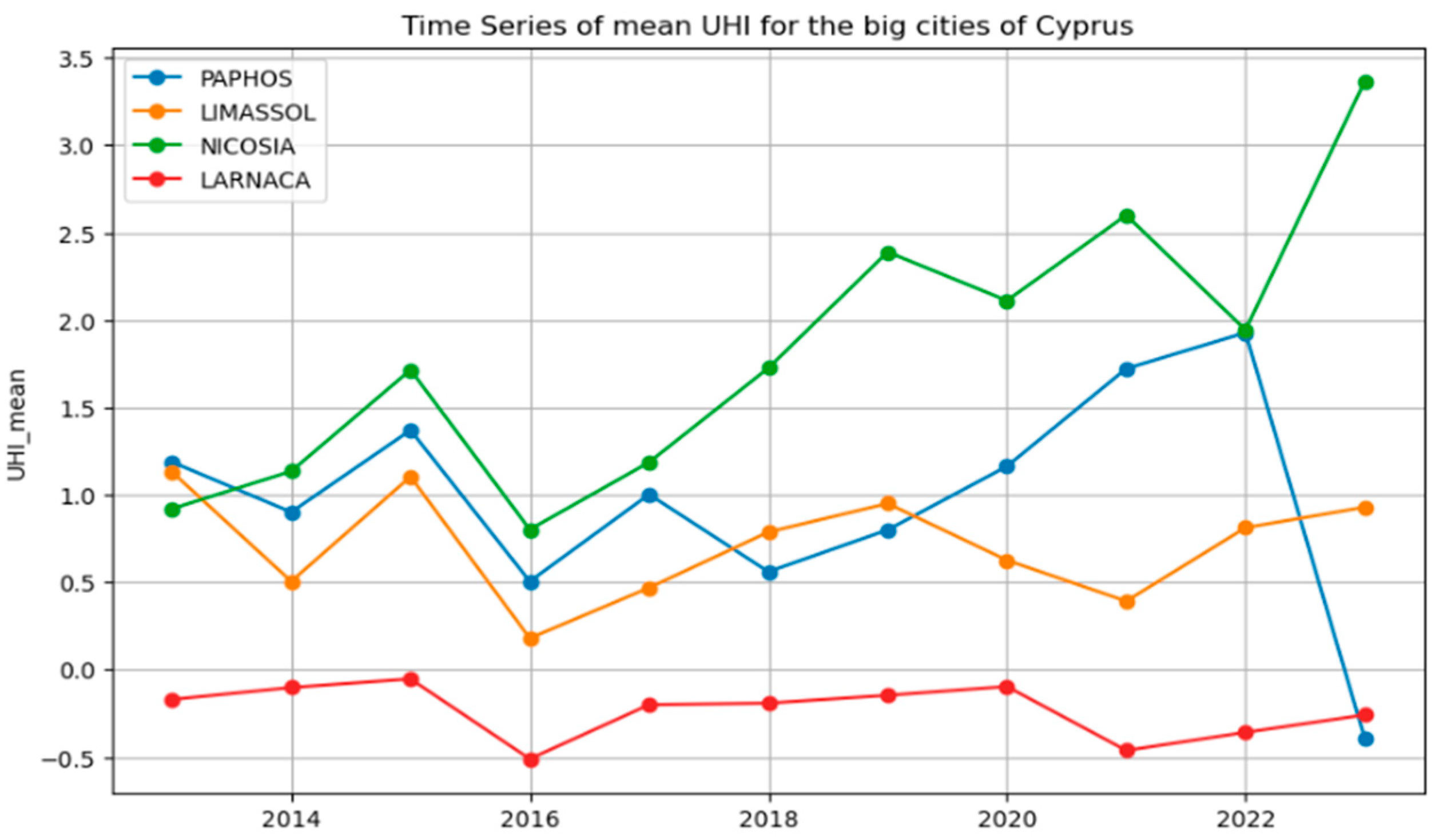 The Study of the Urban Heat Island Effect in Cyprus for the Period 2013–2023 by Using Google Earth Engine †