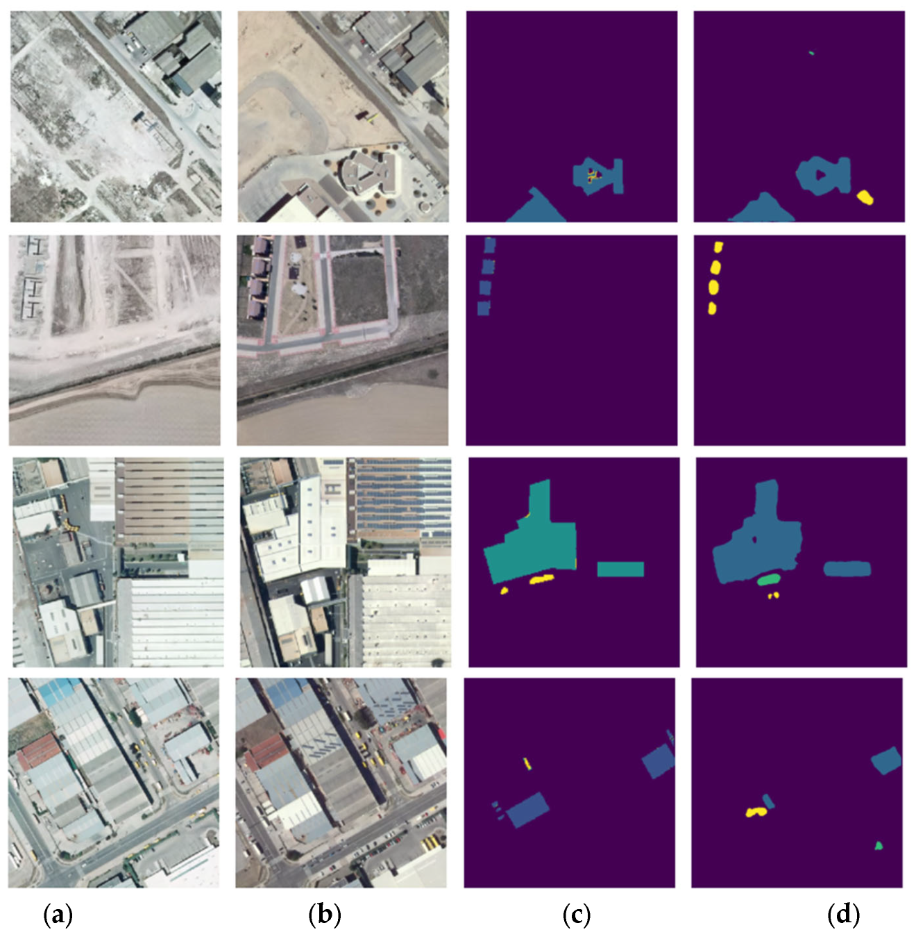 Figure 1) confirms that the proposed model produced sharp and well-defined object boundaries, accurately outlining the contours of new constructions, demolished structures, and modified rooftops. The network effectively preserved spatial detail and minimized noise, resulting in coherent and realistic change patterns.