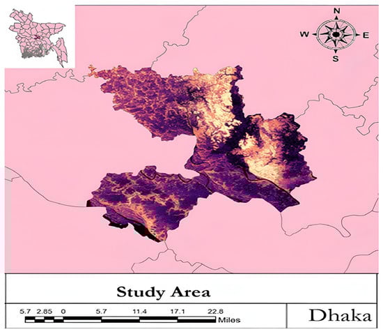 Rapid industrialization has led to issues with sustainable development, including chaotic industrial expansion, environmental degradation, loss of cultivated land, high carbon emissions, and inefficient land use. The UN 2030 Agenda for Sustainable Development 2015 aims to create sustainable cities. To optimize industrial regions and maximize land usage, urban sustainable development requires studying the spatial-temporal patterns of industrial sprawl [11]. The Analytical Hierarchy Process is crucial in this study for systematically evaluating multiple criteria. It also improves the reliability of the research findings presented in the proceedings [12,13]. The studies provide a significant understanding of land suitability and industrial development. The use of Analytic Hierarchy Process can improve the method’s reliability and support better decision-making [14,15,16]. Our study focuses on Dhaka District which is ranked among the world’s most densely populated metropolitan areas, with an average population density of approximately 48,000 inhabitants per square kilometer. Dhaka district is in central Bangladesh, at 23° 48′ 37.85″ N, 90° 20′ 13.88″ E, positioned on the river’s eastern bank of the Buriganga. The city covers 270 square kilometers (100 square miles) and is in the lowest part of the Ganges Delta. Tropical plants and wet soil are common in the flat area that is close to sea level. Dhaka’s Ganges Delta lowland plain is surrounded by the districts of Munshiganj, Gazipur, Rajbari, Tangail, and Manikganj, shown in Figure 1. Dhaka is built on a system of rivers.