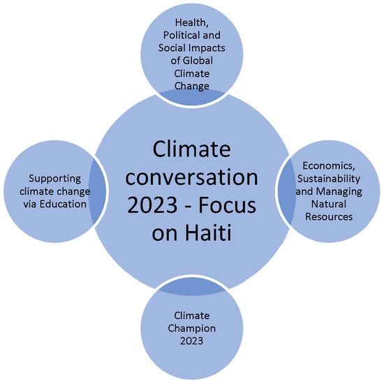 Conceptual Framework for the Virtual Workshop “Climate Conversations 2023—Focus on Haiti. This framework outlines the thematic structure of the one-day virtual workshop, which centered on Haiti’s climate challenges. The event was organized around five key streams: (1) Health, Political, and Social Impacts of Global Climate Change; (2) Economics, Sustainability, and Natural Resource Management; (3) Climate Education; (4) Climate Leadership; and (5) Haiti-specific climate resilience. Each stream featured expert-led discussions designed to foster inclusive, interdisciplinary dialogue. The keynote address was delivered by Dr. Verrett, highlighting the urgency and opportunity for climate action in Haiti.