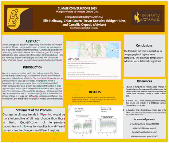 Poster presentation created by students in Dr. Okpodu’s Computational Biology course use R software to compare climate patterns in Wyoming with Haiti. Quantification of temperature anomalies allowed them to visual how different current climate change is in different geographical regions. The were able to compare temperature extremes in two regions. This effort was supported by the NSF GeoPath Award grant 1911600.