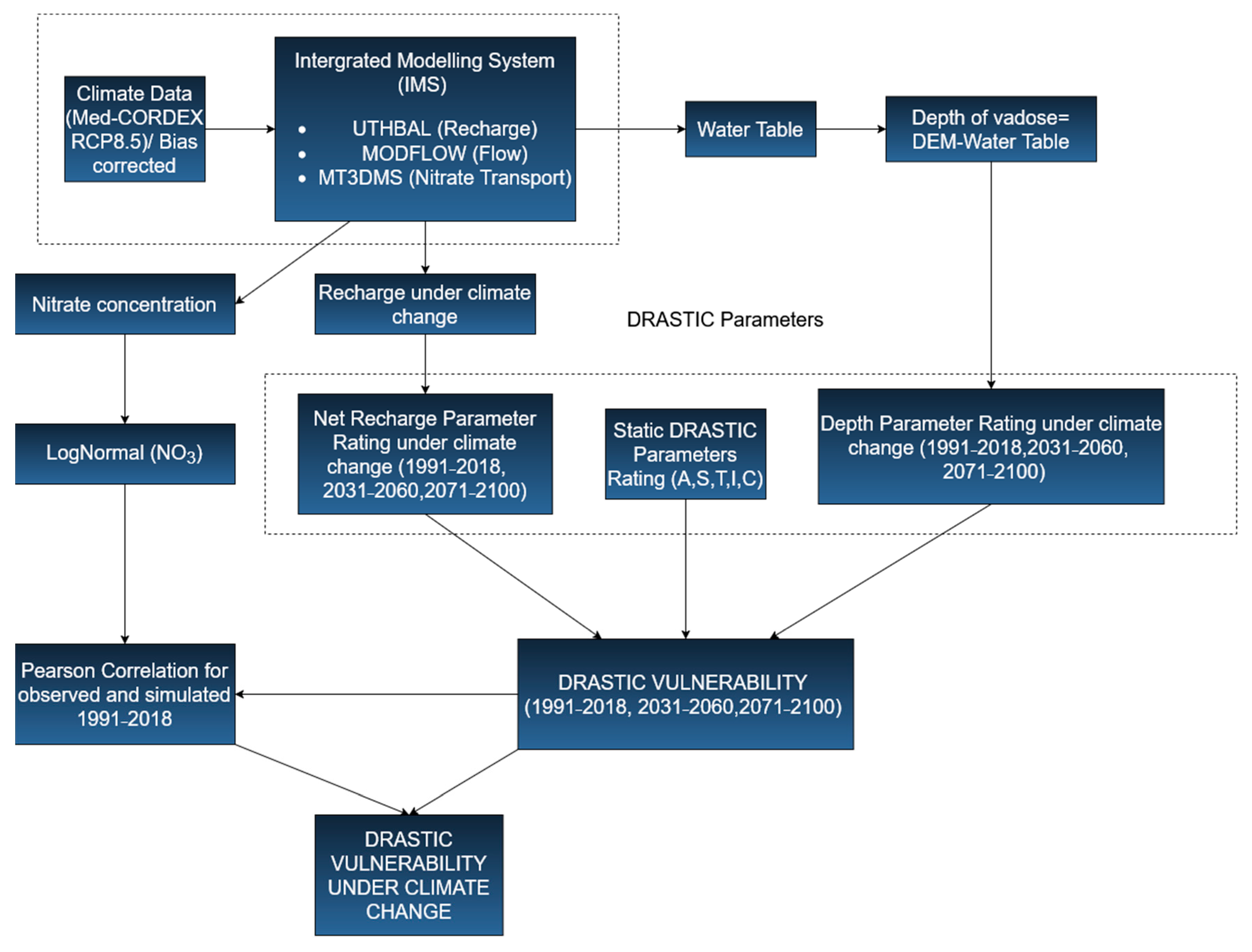 12]. Groundwater recharge, groundwater level variation, and nitrate transport are effectively simulated for current and future time steps using bias-corrected Med-CORDEX climatic estimators for the high-emission RCP8. 5, which provides a climate-driven temporal DRASTIC index. The main novelty of this study lies in the integration of bias-corrected Med-CORDEX regional climate projections into an Integrated Modelling System (IMS), enabling time-varying simulation of net recharge and depth to groundwater, which are subsequently used to update the DRASTIC index. In addition, the study provides a quantitative validation of DRASTIC vulnerability patterns against both observed and simulated nitrate concentrations, offering an empirical evaluation of index performance. The computational approach is subsequently applied to the Almyros groundwater body in Thessaly, Greece, to assess nitrate vulnerability to pressure caused by climate change and to offer directives for adaptive groundwater management in Mediterranean groundwater systems.