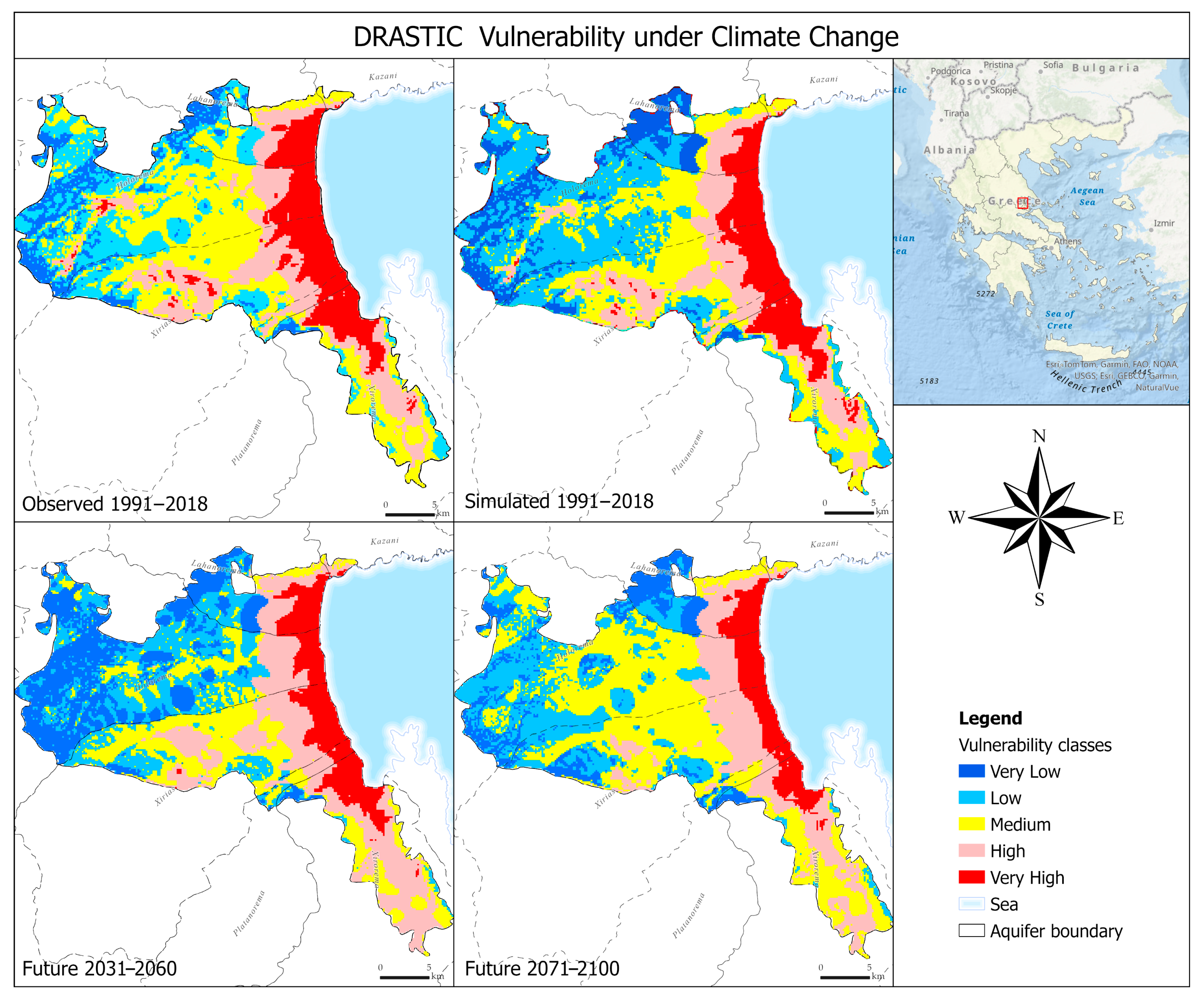 Figure 3. The geographical spread of aquifer vulnerability is estimated under observed (1991–2018) and projected future climate scenarios. During the observed period, low to medium vulnerability dominates central and western inland zones, while high to very high vulnerability is present along coastal and eastern areas, likely due to intensive groundwater abstraction. The vulnerability maps for the observed and simulated period 1991–2018 display minor differences between medium and high vulnerability classes. In the future period 2031–2060, the medium and high vulnerability values occupy larger areas than the high to very high vulnerability ranking. Over the long-term period (2071–2100), vulnerability patterns change significantly, reflecting an overall increase in groundwater vulnerability under climate change. The very high vulnerability zones become more spatially continuous along the coastline zone, while low to medium values are reduced. The dominance of medium to high vulnerability classes across the aquifer indicates that climate change exacerbates the existing pressures rather than creating new vulnerability zones. Broadly, the high and very high values remain in the coast zone throughout all the periods, while inland areas—previously considered relatively secure—are projected to experience significant deterioration in groundwater vulnerability. The temporal evolution from present to future periods underscores the nonlinear nature of vulnerability escalation.