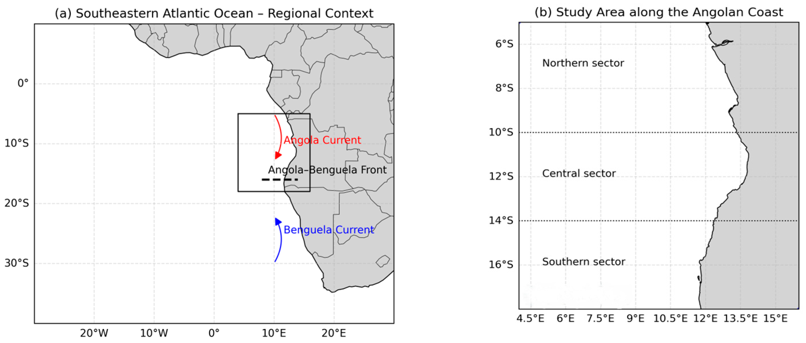Figure 1). This region lies within the transitional zone between the warm, poleward-flowing Angola Current to the north and the cold, equatorward-flowing Benguela Current to the south, and includes the area influenced by the Angola–Benguela Front, a major oceanographic boundary separating tropical and subtropical water masses in the eastern South Atlantic [