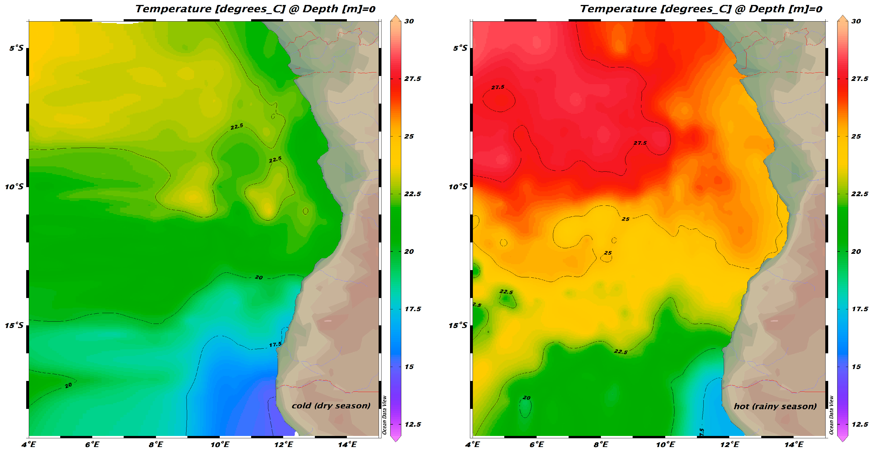 Seasonal variations in thermocline depth strongly regulate stratification and nutrient supply to the surface layer. During the cold season, a shallower thermocline enhances upwelling efficiency, promoting the transport of cold, nutrient-rich waters into the euphotic zone, with important implications for biological productivity and the formation of subsurface oxygen minimum layers. Overall, the temperature structure reflects the dynamic interaction between tropical and subtropical influences along the Angolan coast, highlighting the role of fundamental physical processes in controlling circulation, stratification, and air–sea interactions in the southeastern Atlantic.