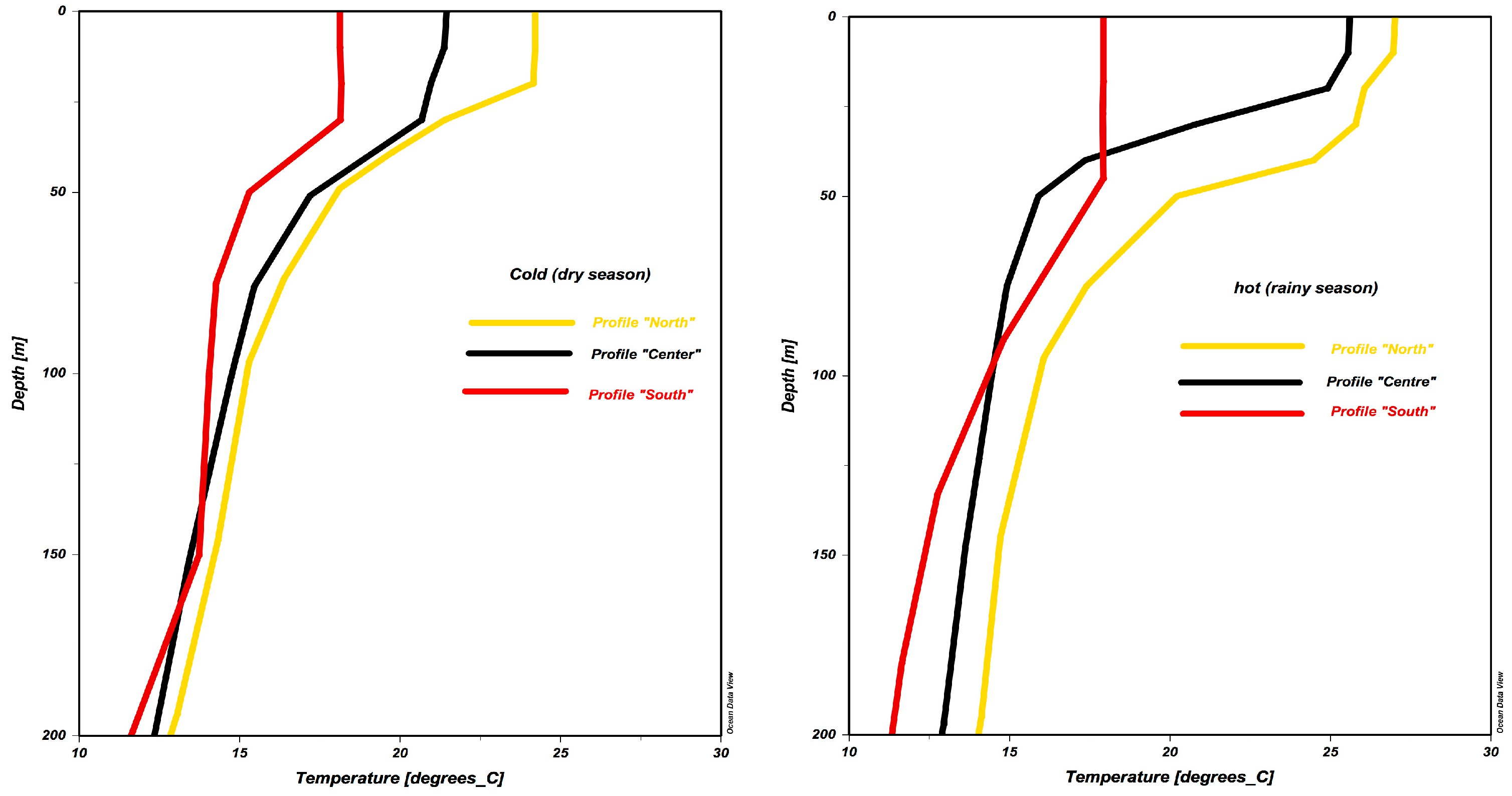 Below the mixed layer, a pronounced thermocline develops between approximately 25 m and 50 m depth, characterized by strong vertical temperature gradients. The thermocline is sharper and shallower in the southern sector during the cold season, consistent with the upward displacement of isotherms driven by coastal upwelling. In the northern sector, the thermocline is deeper and less intense, reflecting the dominance of warm, stratified tropical waters associated with the Angola Current.