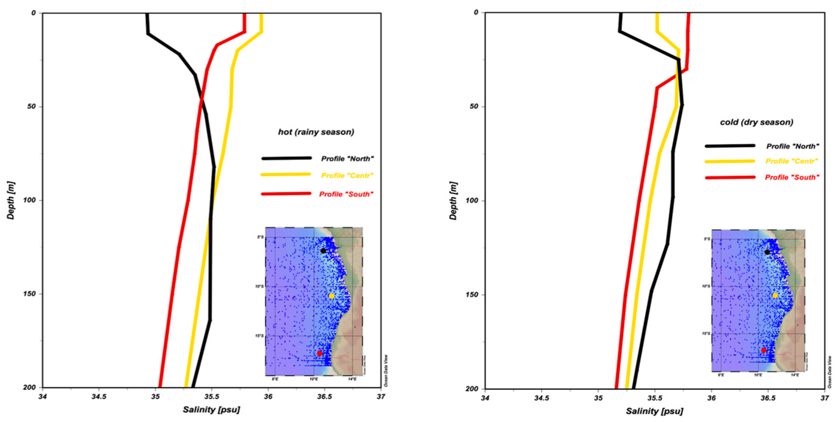 The reduced surface salinity in the northern sector is primarily associated with the influence of tropical surface waters transported southward by the Angola Current, combined with higher precipitation rates and significant freshwater input from river discharge, particularly in the Cabinda region. These processes contribute to the freshening of the surface layer and enhance vertical stratification in the northern coastal zone.