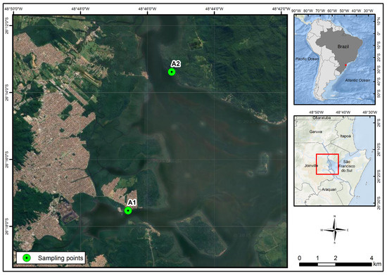 The Babitonga Bay water complex comprises an estuarine region located on the northern coast of the State of Santa Catarina, with a territorial extension of approximately 160 km2, encompassing several municipalities around the city of Joinville, such as Araquari, Barra do Sul, Garuva, Itapoá, and São Francisco do Sul [15,30,31]. The Babitonga Bay (26°14′–26°29′ S; 48°32′–48°50′ W) is influenced by a humid subtropical climate (Cfa), with mean annual precipitation exceeding 2000 mm and mean temperature around 21 °C. During the sampling period (austral summer, January 2023), tidal amplitude averaged 0.8 m and salinity ranged from 18 to 28 psu [30,32].