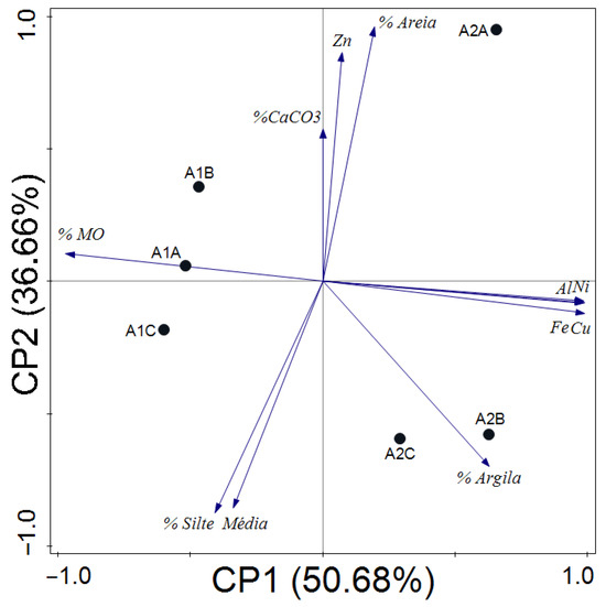 Graphical representation of Principal Component Analysis (PCA) results of sediment variables mean diameter and percentages of sand, silt, clay, organic matter (OM), and calcium carbonate (CaCO3), and the concentrations of heavy metals copper (Cu), aluminum (Al), iron (Fe), zinc (Zn) and nickel (Ni) from the areas of Babitonga Bay, A1: Espinheiros, and A2: Vila da Glória and respective points A1, A2, and A3. PC1: Principal Component 1, and PC2: Principal Component 2 and the percentages of variance in the parentheses.