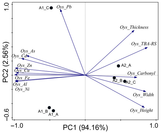 Graphical representation of Principal Component Analysis (PCA) results of sediment variables metals (mg/kg), anatomical measurements (mm), and lipid peroxidation markers (TBA-RS and Carbonyl in nmol MDA/mg protein) in Crassostrea rhizophorae (Oys), collected from the areas of Babitonga Bay, A1: Espinheiros, and A2: Vila da Glória and respective replicates A, B, and C. PC1: Principal Component 1, and PC2: Principal Component 2 and the percentages of variance in the parentheses.