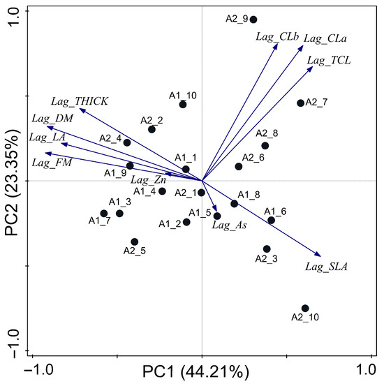 Graphical representation of Principal Component Analysis (PCA) results of morphological, ecophysiological, and chemical attributes of Laguncularia racemosa (Lag) and respective individuals from 1 to 10, which leaves were collected from the areas of Babitonga Bay, A1: Espinheiros, and A2: Vila da Glória. Variables: fresh mass (FM g), leaf thickness (THICK mm), dry mass (DM g), leaf area (LA cm2), specific leaf area (SLA cm2/g), Chlorophyll a (CLa µmol·m−2), Chlorophyll b (CLb µmol·m−2), Total Chlorophyll (TCL µmol·m−2), zinc (Zn mg/kg), arsenic (As mg/kg) PC1: Principal Component 1, and PC2: Principal Component 2 and the percentages of variance in the parentheses.