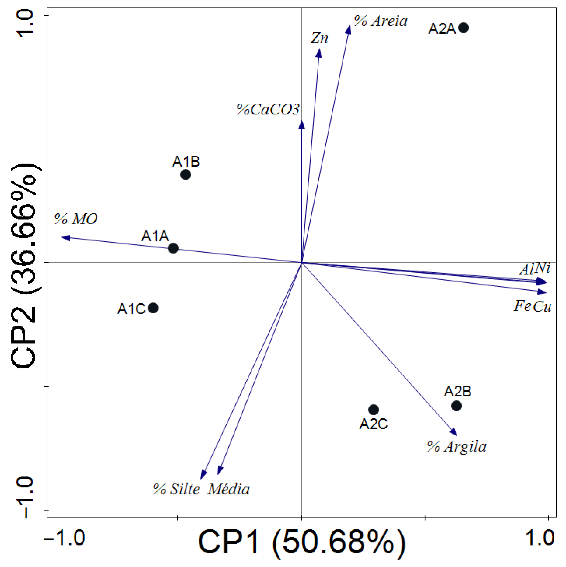 | A2 (Vila da Glória) | Fine to medium silt | 1.33 ± 2.3 | 24.02 ± 8.7 | 63.05 ± 7.6 | 11.60 ± 3.1 | 17.08 ± 0.6 | 8.14 ± 2.5 |