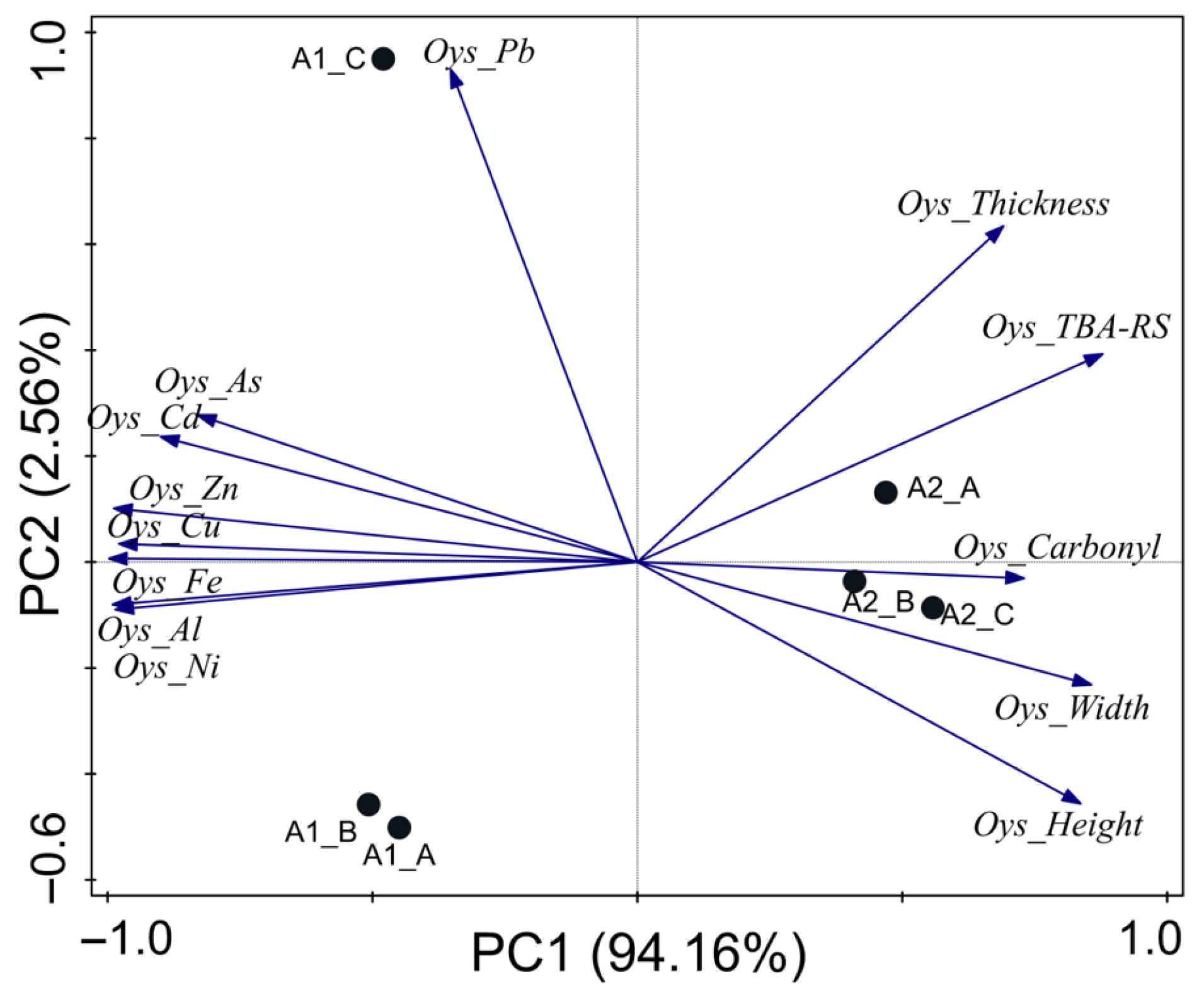 - Azevedo, J.A.M.; Barros, A.B.; de Miranda, P.R.B.; da Costa, J.G.; Nascimento, V.X. Biomonitoring of Heavy Metals (Fe, Zn, Cu, Mn, Cd and Cr) in Oysters: Crassostrea rhizophorae of Mangrove Areas of Alagoas (Brazil). Braz. Arch. Biol. Technol. 2019, 62, e19180211. [Google Scholar] [CrossRef]