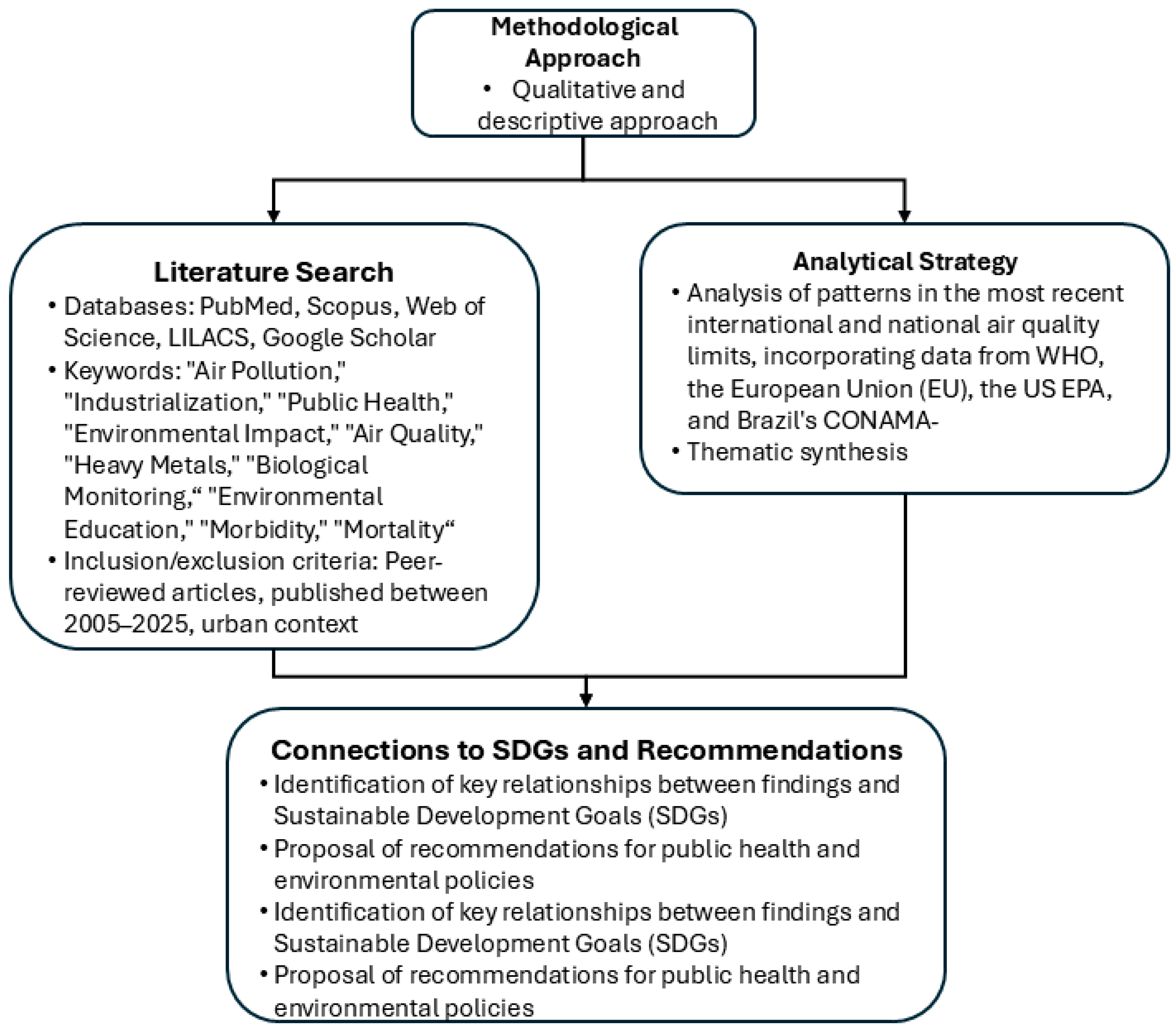 Therefore, this study aims to analyze the impacts of air pollution on urban vulnerability within the context of the 2030 Agenda, identifying convergences and gaps between international air quality standards, public health outcomes, and sustainable development policies. By synthesizing recent scientific evidence and institutional reports, this review seeks to support public policies capable of mitigating air pollution and reducing socio-environmental inequalities. Specifically, the analysis is structured around four main axes: