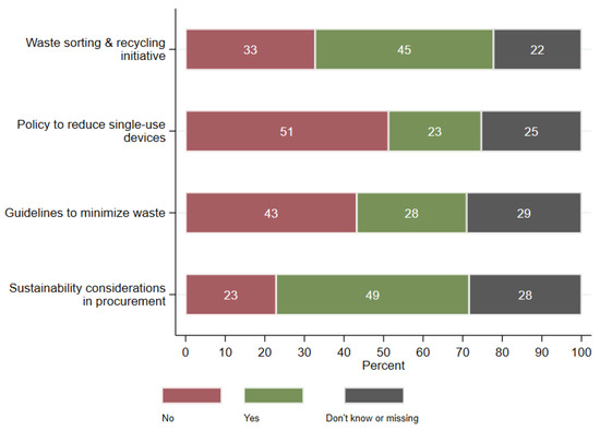 Notably, between 22.4% and 29.2% of respondents were unaware of their institution’s environmental policies across all four measures, suggesting limited communication of these initiatives to practicing clinicians.