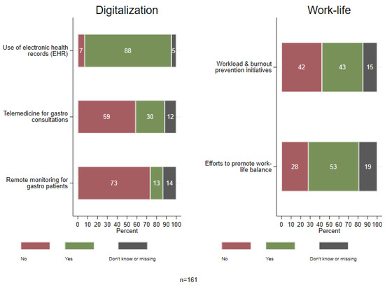 Figure 2 illustrates the self-reported uptake of digital tools. 88.2% of respondents reported having an EHR system in place, 6.8% did not, and 5.0% were unsure. Telemedicine for gastroenterology consultations was reported as available by 29.8% of participants, and 13.0% reported having remote patient monitoring in place.