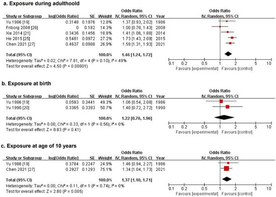 Five previous case–control studies, including three studies from the research group of Yu et al., examined the association between incense burning at early ages and NPC risk in Chinese populations in different areas. None of them found statistically significant associations. For exposure at birth, one of these three studies only reported the results as non-significant (p = 0.14). The pooled OR for NPC risk associated with incense burning at birth combining two studies was 1.22 (95% CI 0.76–1.96) (Figure 2b). For exposure at the age of 10 years, two studies described the results as non-significant (p = 0.34 and p = 0.23). The pooled OR for NPC associated with incense burning at the age of 10 years combining the other two studies was 1.37 (95% CI 1.10–1.71) (Figure 2c).