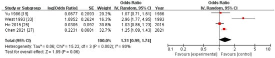 Six previous case–control studies reported associations between mosquito-coil burning during adulthood and NPC risk. A meta-analysis of the four studies with NOS scores of at least 6 generated a pooled OR of 1.31 (95% CI 0.99–1.74) in a random-effects model, with high heterogeneity across studies (p = 0.002, I2 = 80%) (Figure 3). The pooled OR did not substantially change in the sensitivity analysis removing one study at each time (Supplementary Figure S3).
