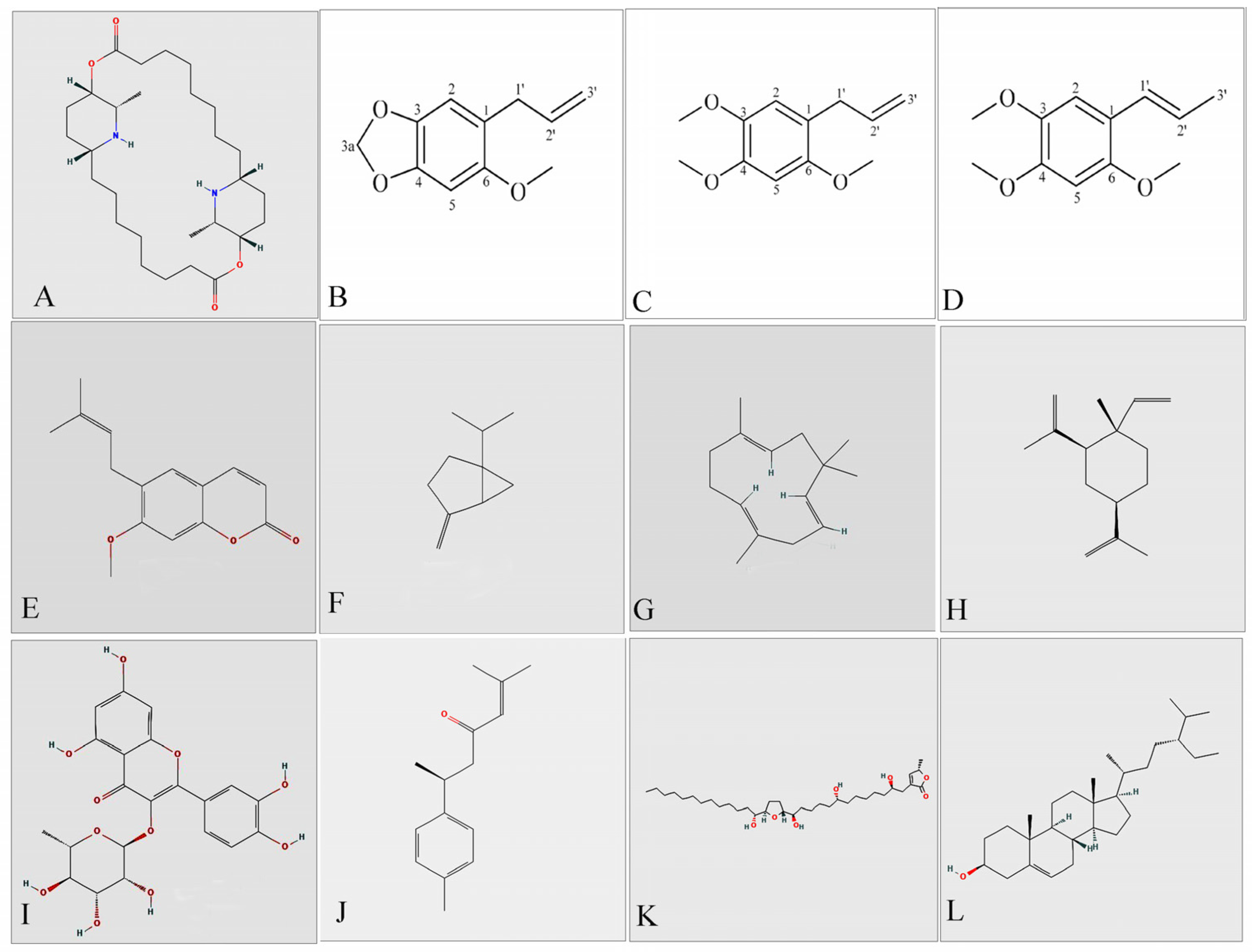 | Piper sarmentosum Roxb. (Piperaceae) Tippili, Pipul | Roots | Root extract (Hexane) | Asaricin 1 (C11H12O3) (Figure 4B), Isoasarone 2 (C12H16O3) (Figure 4C), Trans-asarone 3 (C12H16O3) (Figure 4D) | Late 3rd or early 4th larvae of Ae. aegypti, Ae. albopictus | Acetylcholinesterase (AChE) inhibition | IC50- 0.73–2.24 μg/mL | [54] |