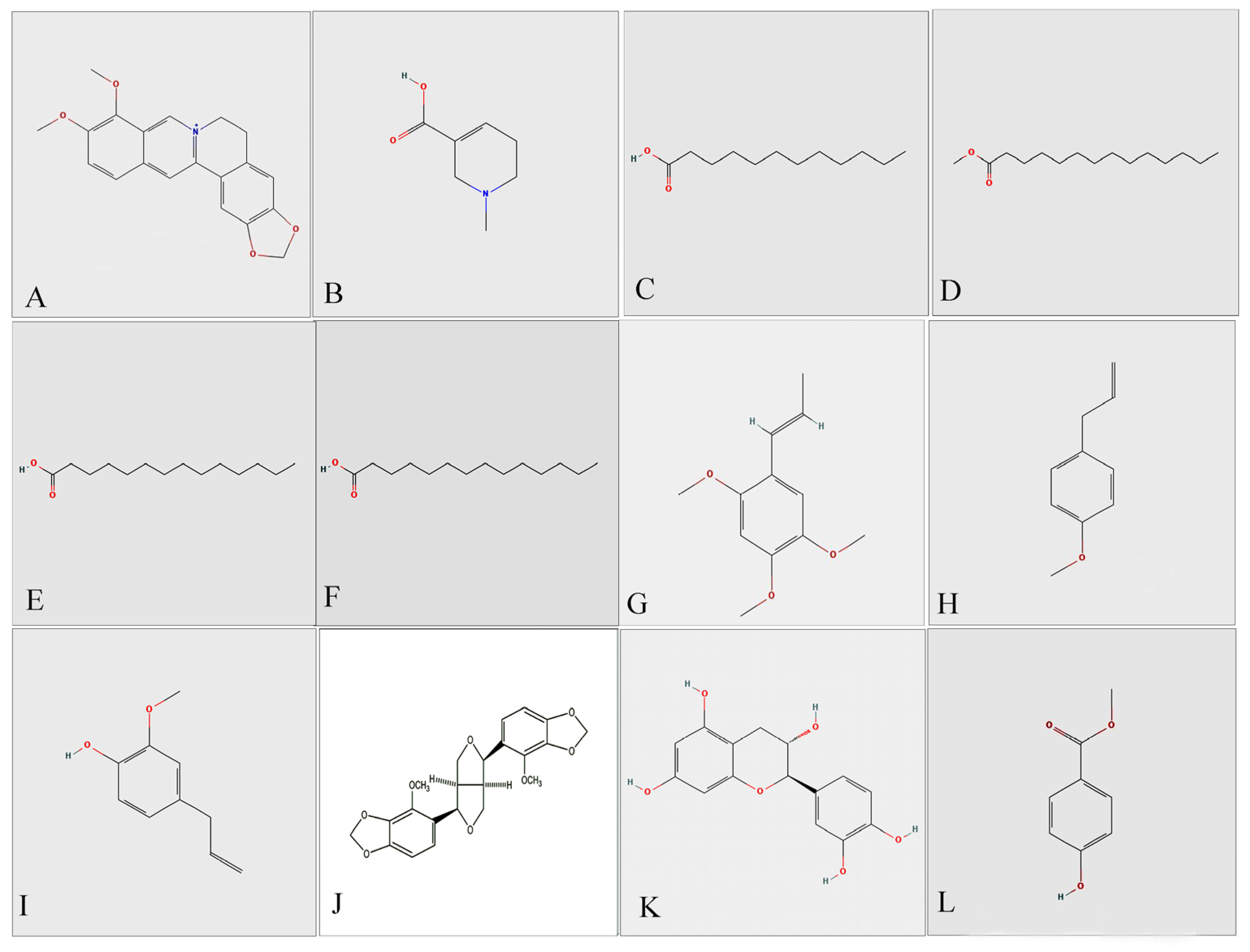 - Bharathithasan, M.; Ravindran, D.R.; Rajendran, D.; Chun, S.K.; Abbas, S.A.; Sugathan, S.; Yahaya, Z.S.; Said, A.R.; Oh, W.-D.; Kotra, V.; et al. Analysis of Chemical Compositions and Larvicidal Activity of Nut Extracts from Areca catechu Linn against Aedes (Diptera: Culicidae). PLoS ONE 2021, 16, e0260281. [Google Scholar] [CrossRef] [PubMed]