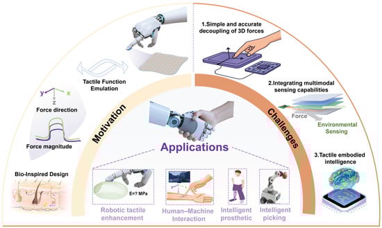 Tactile sensing, as a fundamental sensory modality for human interaction with the environment, plays a crucial role in fine manipulation and natural human–computer interaction [1,2,3,4,5,6]. Human skin exhibits high sensitivity to various mechanical stimuli, including normal and shear forces, thereby enabling precise perception in complex environments [7,8,9,10,11]. In recent years, the rapid development in flexible technology (e.g., electronic skin [12,13,14], electronic textiles for healthcare and printed electronics [15,16,17], as well as energy harvesting and interactive textile devices [18,19], etc.) has led to significant advances in tactile sensing. Primary sensing mechanisms include resistive sensing based on pressure-induced contact resistance variations [15,20,21,22], and capacitive sensing utilizing changes in inter-electrode capacitance caused by distance/area variations [23,24,25], as demonstrated in the additively manufactured micro-lattice dielectrics for multiaxial capacitive sensors [26]. Sensors based on resistive and capacitive are passive sensors can response to both static and dynamic stimuli, but they require external power supply for operation. On the other hand, piezoelectric [27,28,29] and triboelectric mechanism [30,31,32] are self-powered sensing mechanism that can directly generate electrical output signals under applied mechanical stimuli without power supply, but they normally can only response to dynamic stimuli which limits their applications in certain scenarios. The piezoelectric mechanism is based on the well-known piezoelectric effect, while the triboelectric mechanism is based on the coupling effect of contact electrification and electrostatic induction during the materials’ contact-separation processes. Furthermore, the integration of flexible tactile sensors with artificial intelligence has propelled the realization of intelligent robotics technology (focusing on bionic tactile perception [33,34,35], softness detection [36], and adaptive grasping [37,38,39,40], etc.), as well as intelligent wearable interaction systems (encompassing gesture and force decoding [41], scalable and high-resolution tactile skins [42], tactile interfaces [43,44,45], and health monitoring [46,47], etc.). Owing to the combined advancements in flexible polymer substrates and microstructural design, the latest generation of tactile sensors overcomes the physical constraints of traditional rigid devices and enhances both wearing comfort and system integration through their stretchable, bendable, and conformal characteristics [48,49,50].
