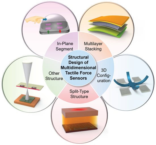 Five representative structural paradigms of multidimensional force sensors: in-plane segment, multilayer stacking, 3D configuration, split-type structure and other structure.