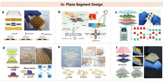 In short, various tactile sensing mechanisms based on an in-plane segmentation strategy achieve efficient decoupling and perception of multidimensional force within a single planar layer through meticulously designed force transfer structures. This design not only ensures structural simplification, flexibility, miniaturization, and ease of array integration for the device, but also significantly enhances sensing performance and expands functionality.