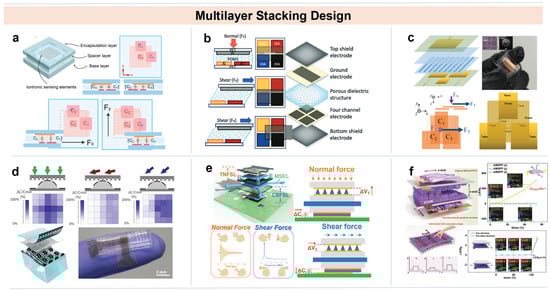 For layering within a single sensor, capacitive sensing mechanisms are commonly employed. For example, as shown in Figure 4a, inspired by the skin’s multilayered structure, a hydrogel-based ionic sensor was proposed [60]. The top encapsulation layer, elastic spacer layer, and base layer are interlocked via mortise-and-tenon joints to prevent interlayer misalignment and enhance mechanical robustness. An asymmetric electrode configuration consisting of a shared top electrode and three independent bottom electrodes forms a capacitive set. Normal forces cause all capacitances to increase synchronously, while shear forces alter only specific capacitance values, enabling omnidirectional force decoupling.