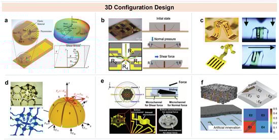 3D configuration design overcomes the limitations of planar structures in force decoupling, anisotropic sensing, and spatial utilization efficiency by arranging and integrating sensing units or force transmission paths within 3D space. Its core principle lies in leveraging spatial dimensions to construct independent or differentiated force response channels. This enables natural physical or electrical decoupling of normal and shear forces. Coupled with specific algorithms, decoupling accuracy can be further enhanced. This design offers excellent force decoupling performance, high directional resolution and sensitivity, while improving spatial utilization efficiency and adaptability. However, its manufacturing processes are generally more complex, structural design presents significant challenges, and signal processing and calibration are also more complex.