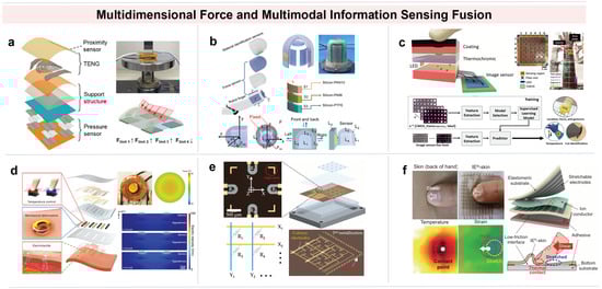 Tactile perception, as a core capability for human–machine interaction and environmental exploration, encompasses far more than mere multidimensional force detection. It integrates critical information modalities such as temperature, material properties, and surface roughness [125,126]. In biological systems, force sensing is intrinsically coupled with other modalities—for instance, mechanoreceptors and thermoreceptors in human skin work synergistically to perceive touch, temperature, and vibration, enabling nuanced interaction with the environment. To equip robots or intelligent systems with comprehensive environmental sensing capabilities approaching or even surpassing human levels, researchers are dedicated to developing multimodal sensors capable of simultaneously capturing these complex signals. In this pursuit, bio-inspired design principles—mimicking the sophisticated structure and multifunctional integration of human skin to organically fuse diverse sensing components—have been widely validated as a highly promising technological pathway [127,128,129,130,131].