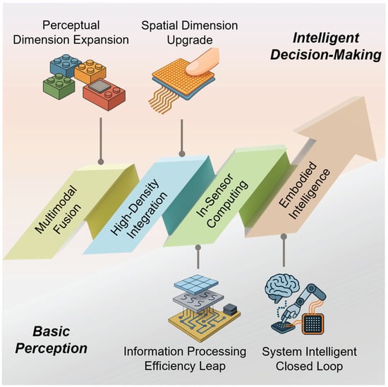 Then comes the in-sensor computing, which enables a revolutionary leap in information processing efficiency. Faced with the massive data generated by high-density, multimodal sensors, the traditional “sensing-transmission-centralized processing” model encounters bottlenecks in bandwidth, latency, and power consumption. The future breakthrough lies in the exploration and implementation of the in-sensor computing architecture. The core idea is to preprocess raw data, extract features, and even make preliminary decisions at or near the sensor end, significantly reducing redundant data transmission and lowering system latency and energy consumption. This requires the deep integration of novel neuromorphic electronic devices, analog computing circuits, in-memory computing, and advanced edge AI algorithms with sensing hardware [195,196,197,198,199]. Edge AI algorithms are a type of algorithm that brings AI data processing capabilities from distant cloud servers down to the device itself or to local computing units near the device. Their core advantages are efficiency, low latency, and privacy protection.