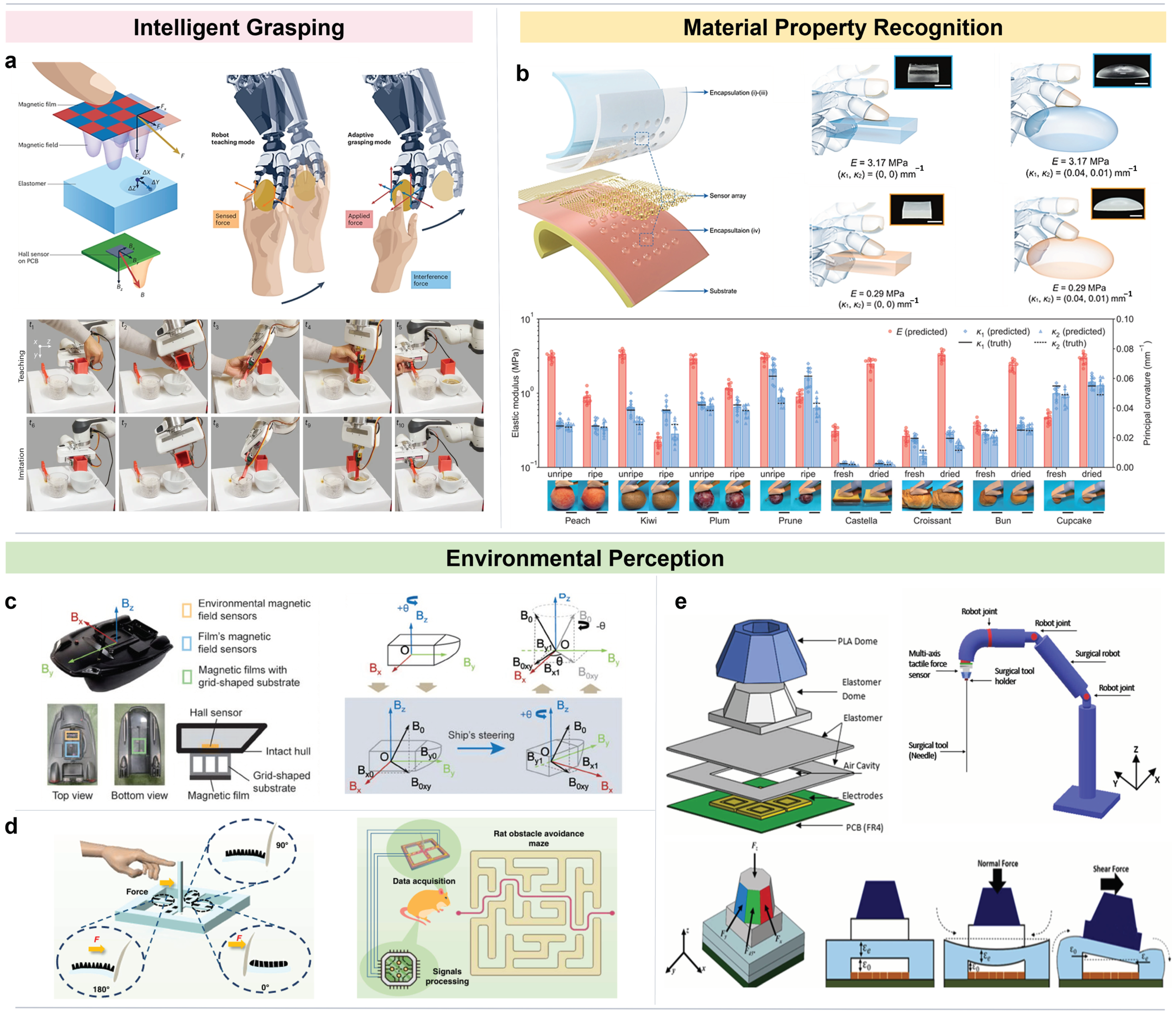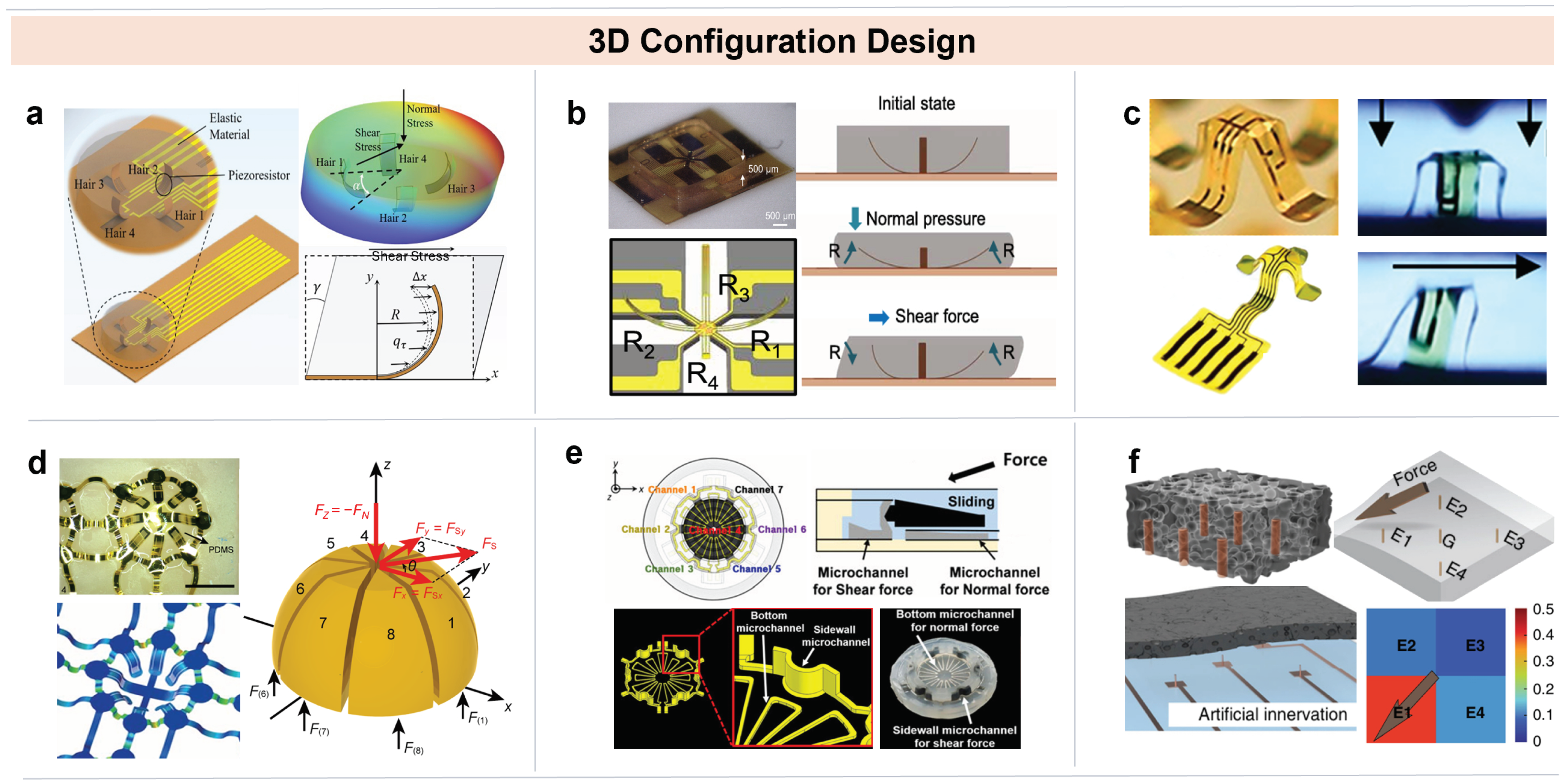 | [8] Figure 5d | Bionic 3D architecture | Normal: 5 × 10−5 Pa−1; Shear: 6 × 10−4 N−1 | <1.5° | Normal: 0–80 kPa; Shear: 0–0.5 N | / | Real-time measurement of elastic modulus | |