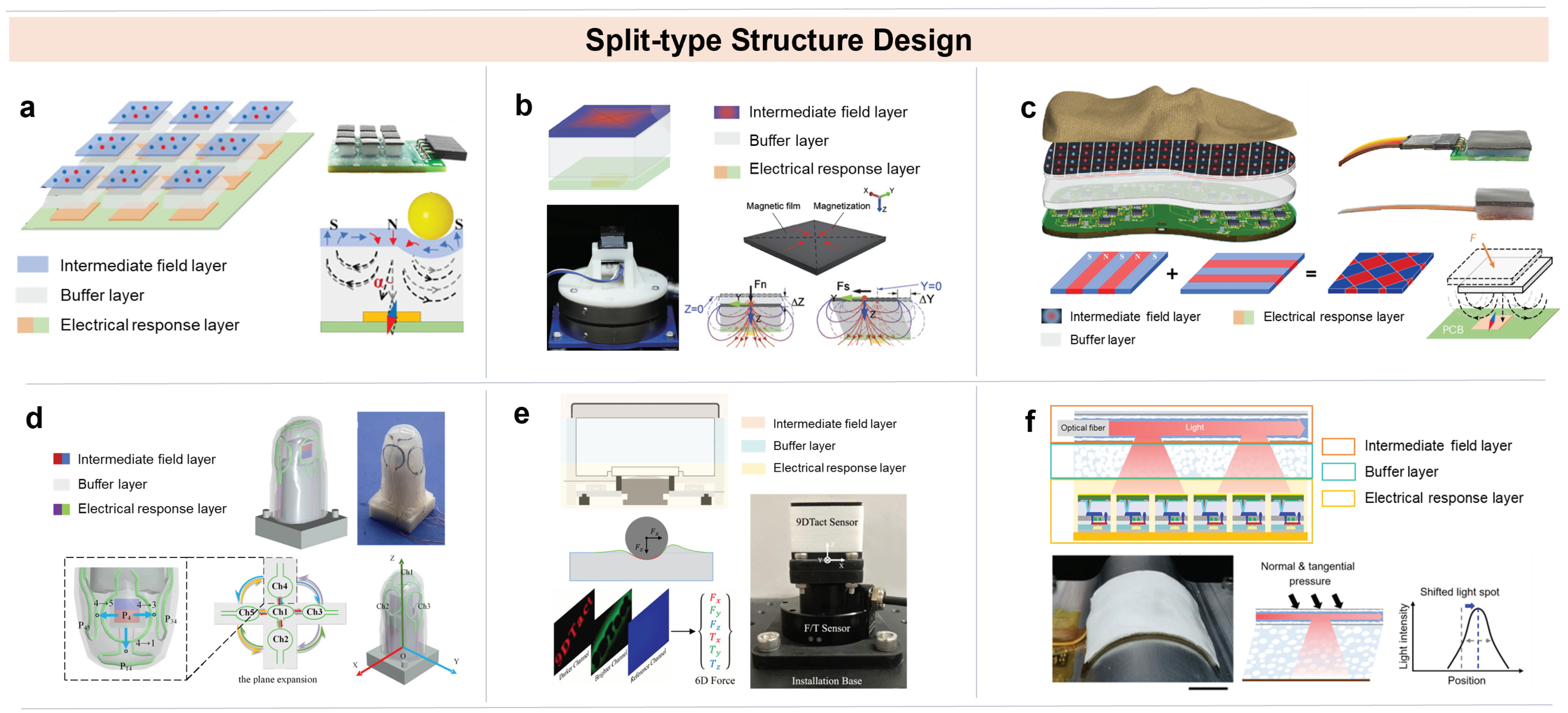| Split-Type Structure | [105] Figure 6a | Sine-magnetized thin film | Normal: 0.01 kPa−1; Shear: 0.1 kPa−1 | / | Normal: 0–120 kPa; Shear: 0–16 kPa | 15 ms | Stable grasping of fragile objects |