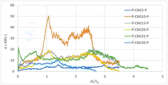 In almost all cases, the Peak 2 value is higher than the Peak 1 value (e.g., 15% CBG, RH 60%: Peak 1 = 9.43 MPa, Peak 2 = 12.87 MPa). The nature of “Peak 1” and “Peak 2” is not explicitly defined, but in a tensile test, this could mean that Peak 1 (Initial Elastic/Plastic Deformation Strength) represents the point where the first localized failure occurs, or an apparent yield strength. Peak 2 represents the maximum overall strength that the system can withstand. The fact that it is higher suggests that, after the initial reorganization or failure (Peak 1), the polymer network (cohesion) or the interface (adhesion) reorganizes under stress, or that the load is redistributed more efficiently until a global maximum is reached (Peak 2). This implies ductile rather than brittle behavior.