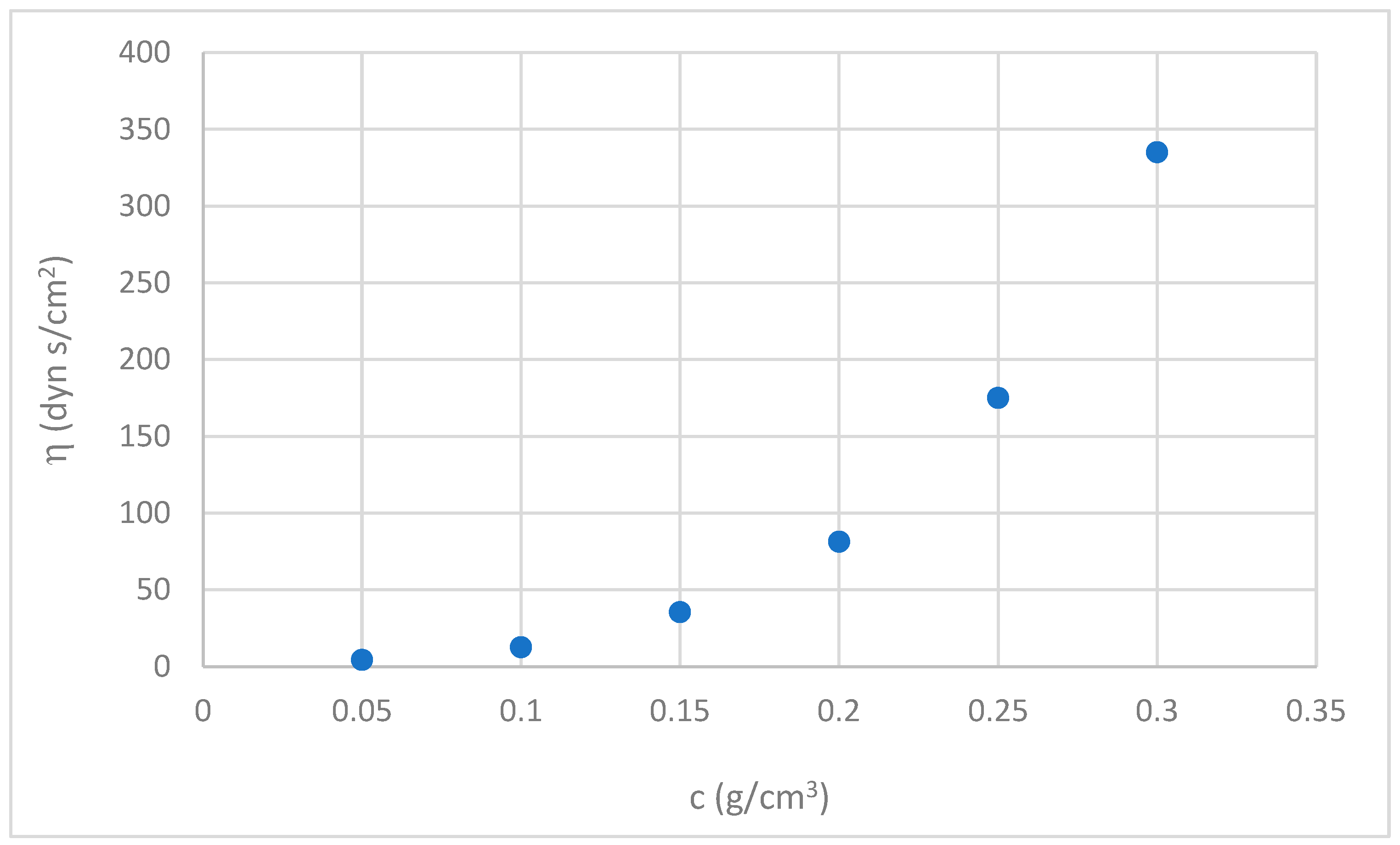 Figure 2 shows how the viscosity (η) of a chañar brea gum solution is affected by its concentration (c). As the concentration increases, so does the viscosity of the fluid, but not linearly.