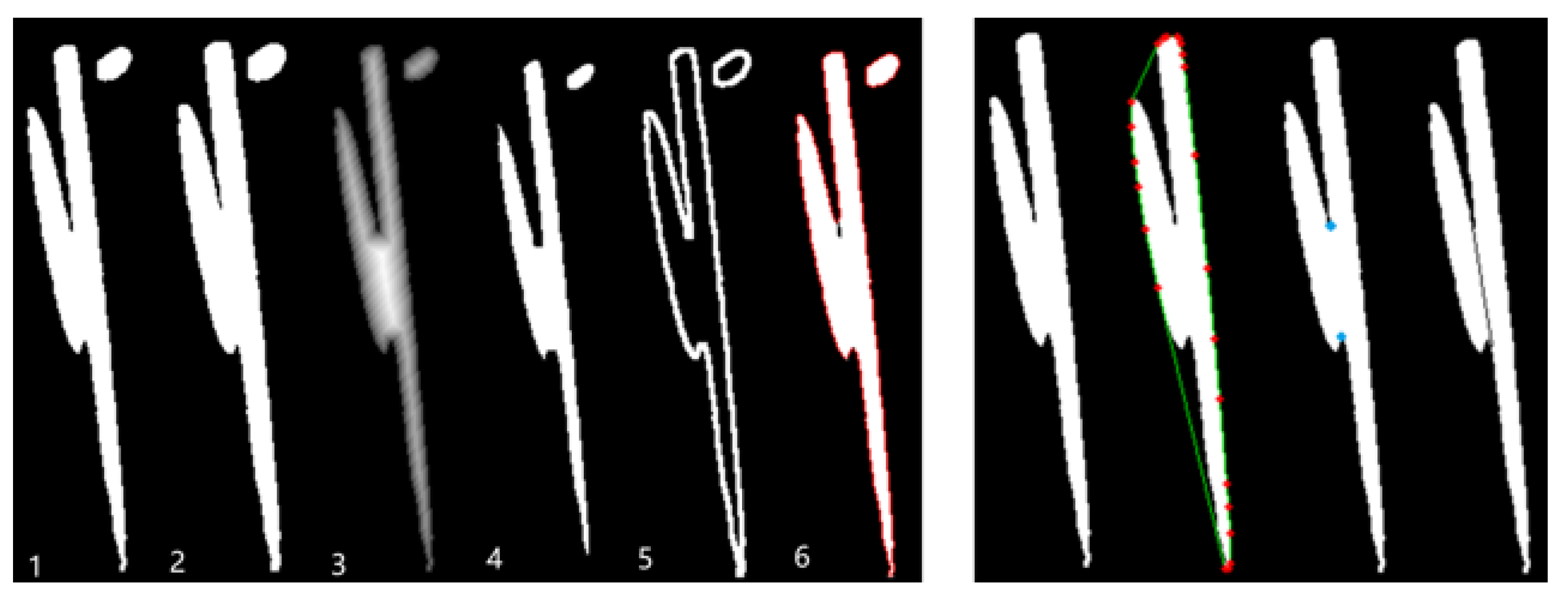- Suzuki, S. Topological structural analysis of digitized binary images by border following. Comput. Vision Graph. Image Process. 1985, 30, 32–46. [Google Scholar] [CrossRef]