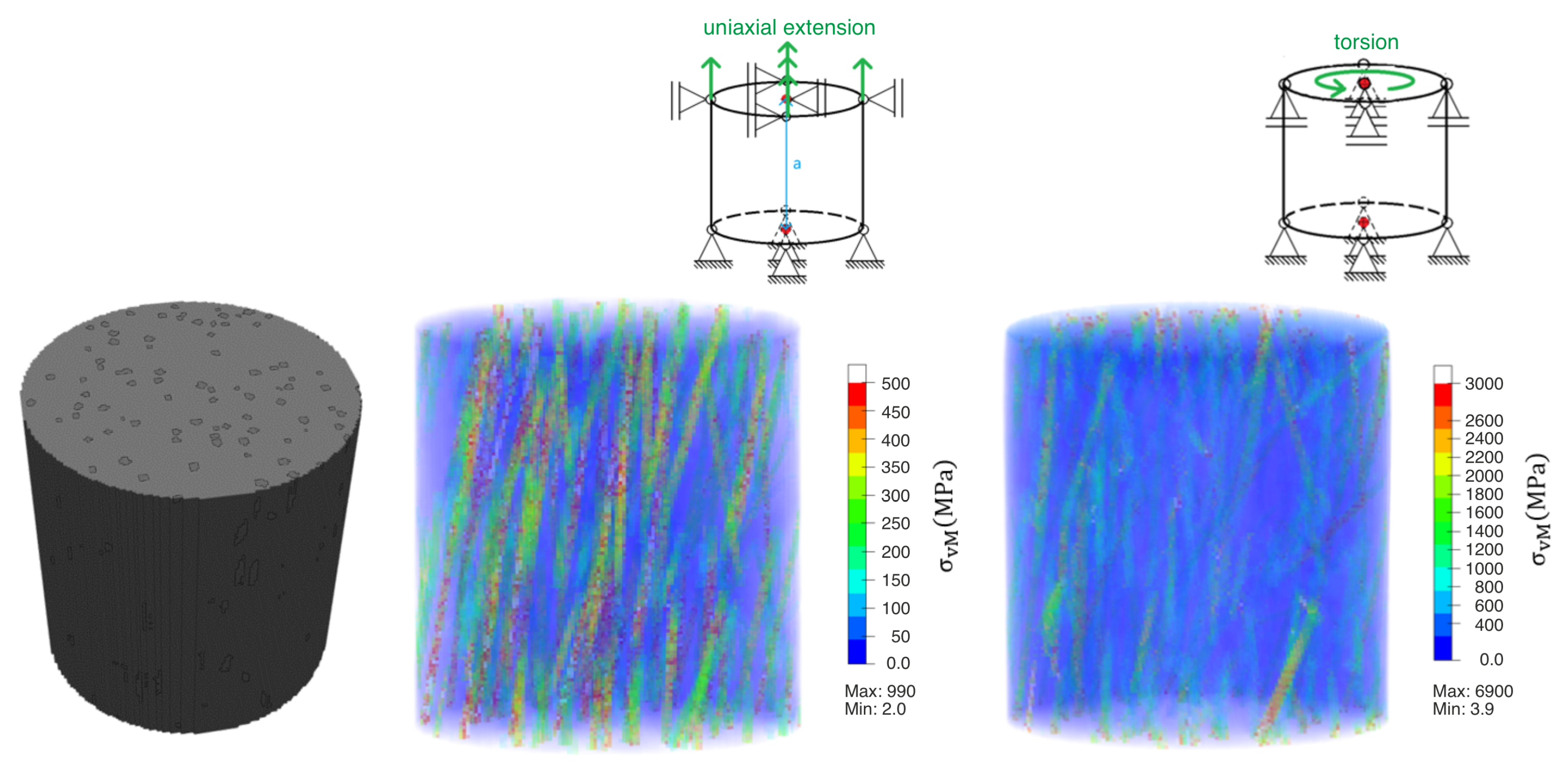 - Three-dimensional voxel-based FEM simulations under inhomogeneous uniaxial extension and clockwise torsion at reproduced anisotropic stiffness behaviour and revealed shear-dominated load paths, with local von Mises stresses up to 70 MPa.