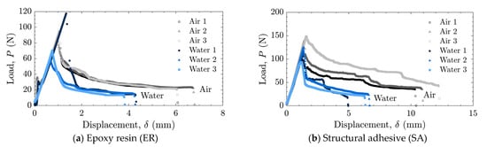 Load–displacement relationships for as-received specimens tested in air and water using (a) epoxy resin (ER) and (b) structural adhesive (SA).