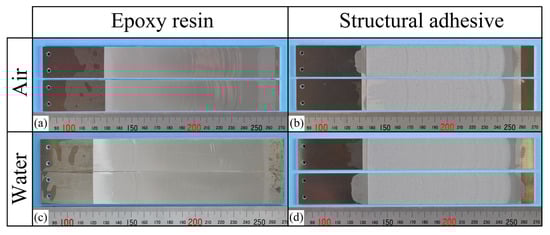 Adhesion at the aluminum/epoxy resin interface depends on physical, mechanical, and chemical bonding [23]. Focusing on chemical bonds in particular, hydroxyl groups on the aluminum surface and hydroxyl groups on the epoxy resin form hydrogen bonds [24], and a significant linear relationship was found between the amount of hydroxyl groups on the aluminum surface and peel strength [25]. However, molecular simulations demonstrated hydrogen bond disruption under water immersion [26,27,28]. Therefore, the chemical bonding is considered highly susceptible to water; a significant impact is expected on the aluminum/epoxy resin interface by localized water exposure. However, few quantitative studies have experimentally evaluated the influence of water presence at the crack front on interfacial crack propagation.