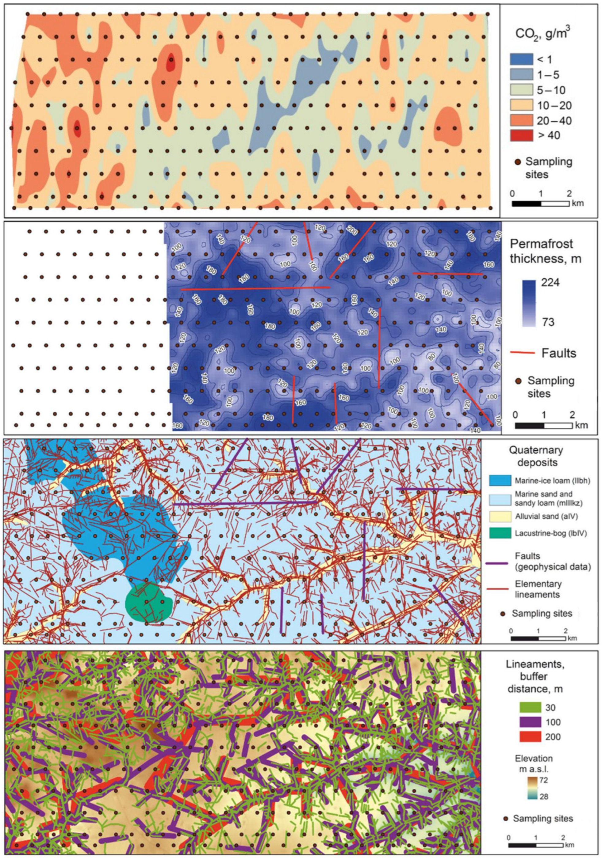 - Kraev, G.; Belonosov, A.; Veremeeva, A.; Grabovskii, V.; Sheshukov, S.; Shelokhov, I.; Smirnov, A. Fluid Migration through Permafrost and the Pool of Greenhouse Gases in Frozen Soils of an Oil and Gas Field. Remote Sens. 2022, 14, 3662. [Google Scholar] [CrossRef]