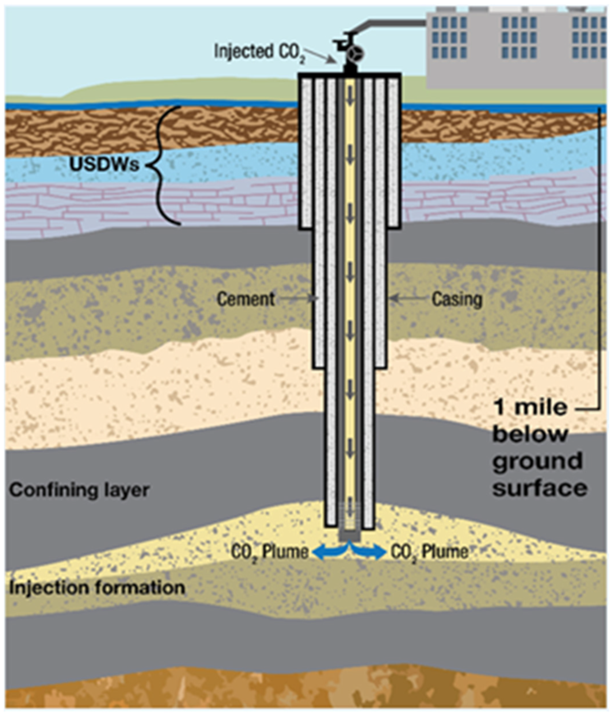 - EPA. Class VI—Wells Used for Geologic Sequestration of Carbon Dioxide. Available online: https://www.epa.gov/uic/class-vi-wells-used-geologic-sequestration-carbon-dioxide (accessed on 29 September 2025).