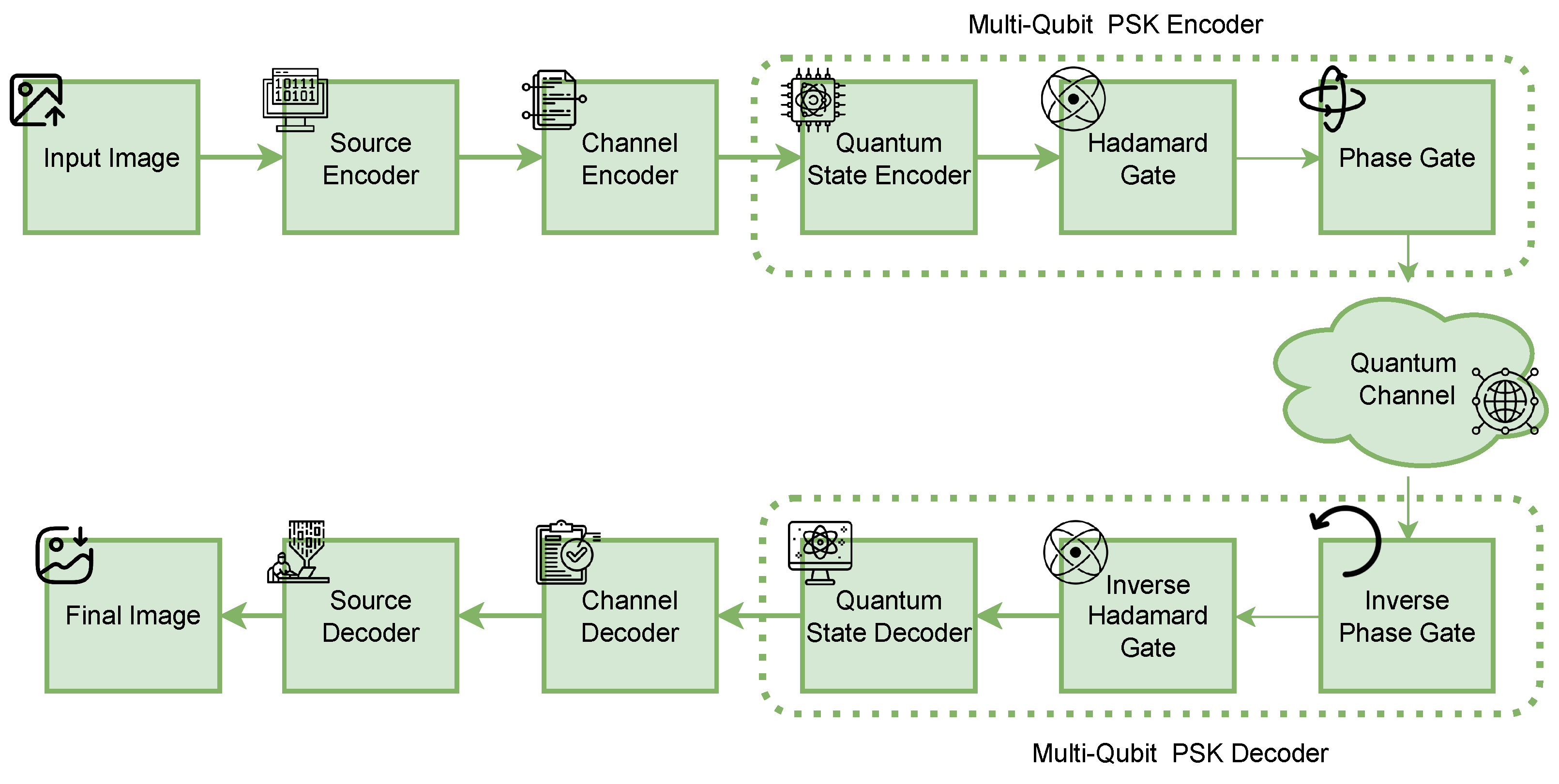 11]. Motivated by these challenges, this work introduces a scalable multi-qubit PSK encoding framework that jointly leverages superposition and phase modulation to improve spectral efficiency, fidelity, and noise resilience in quantum image transmission. Therefore, our proposed study presents a novel multi-qubit PSK encoding scheme for high-fidelity image transmission over quantum channels.