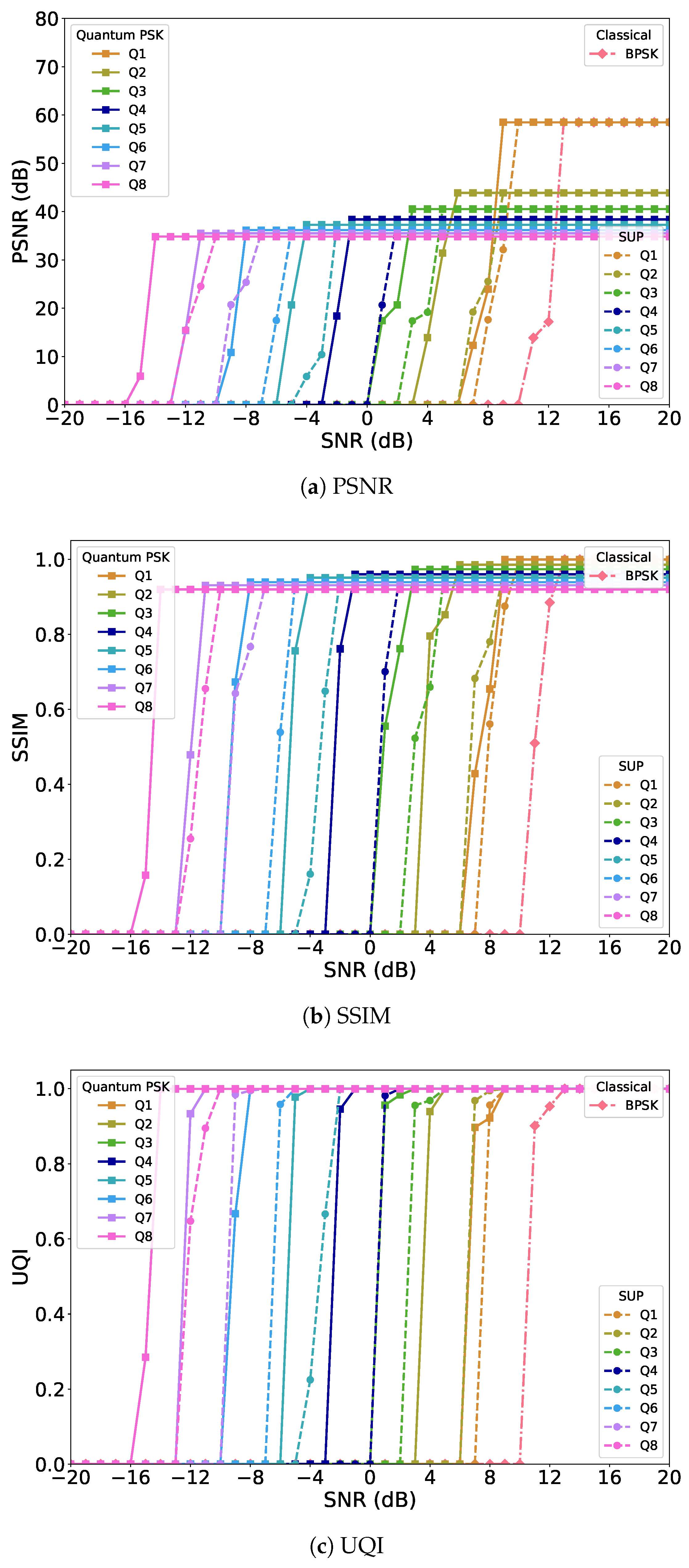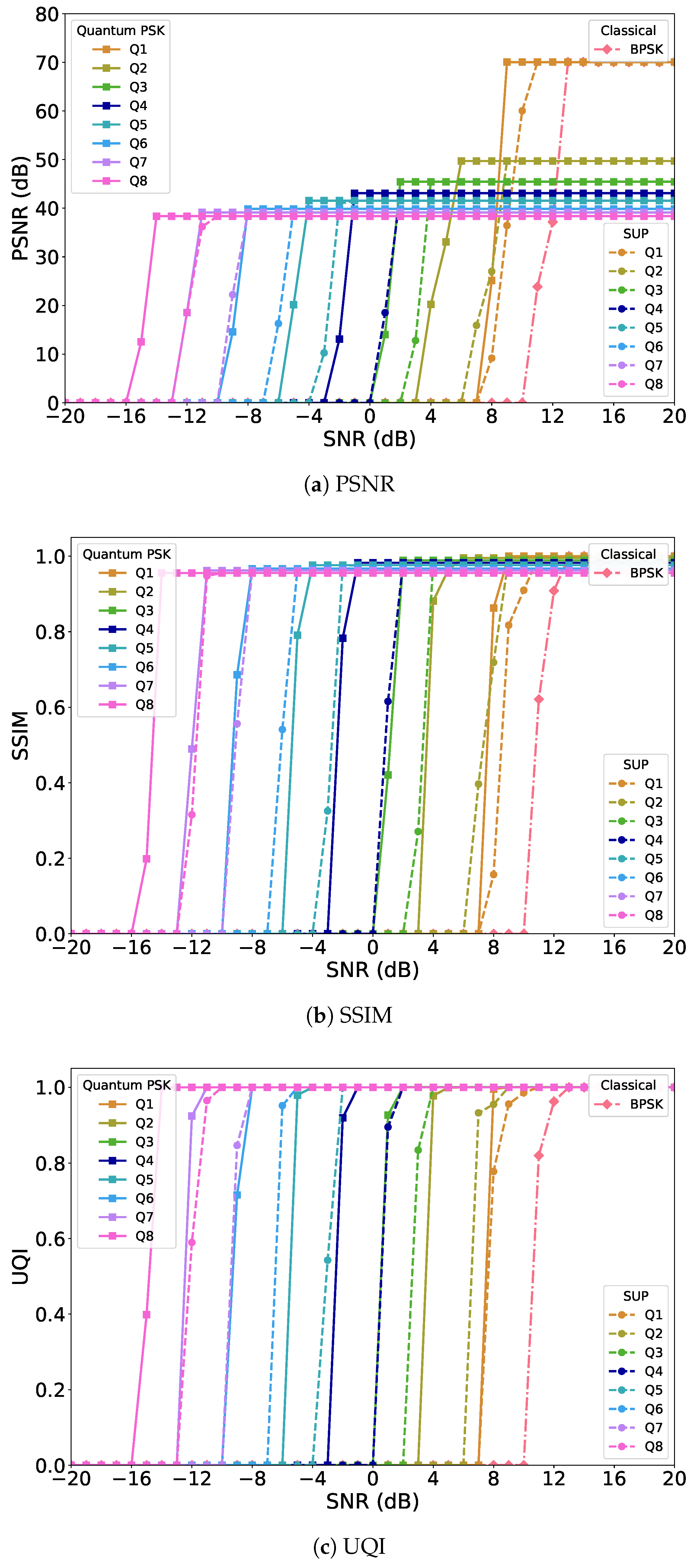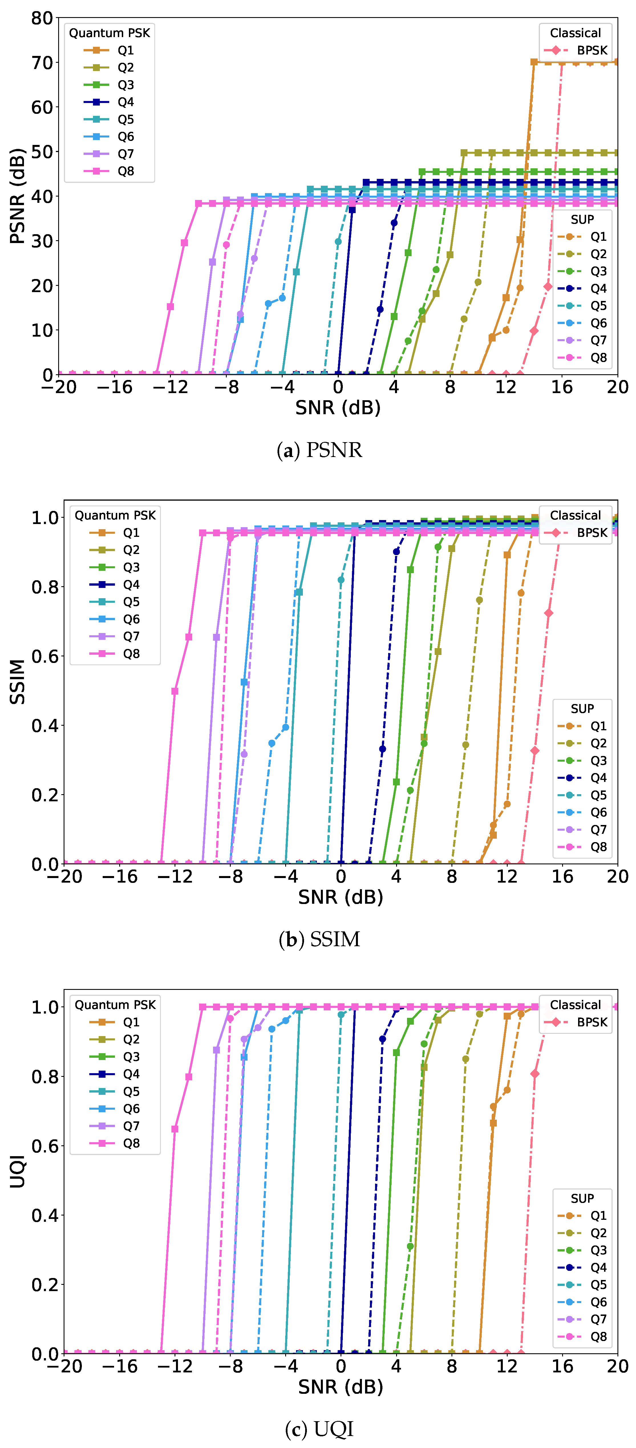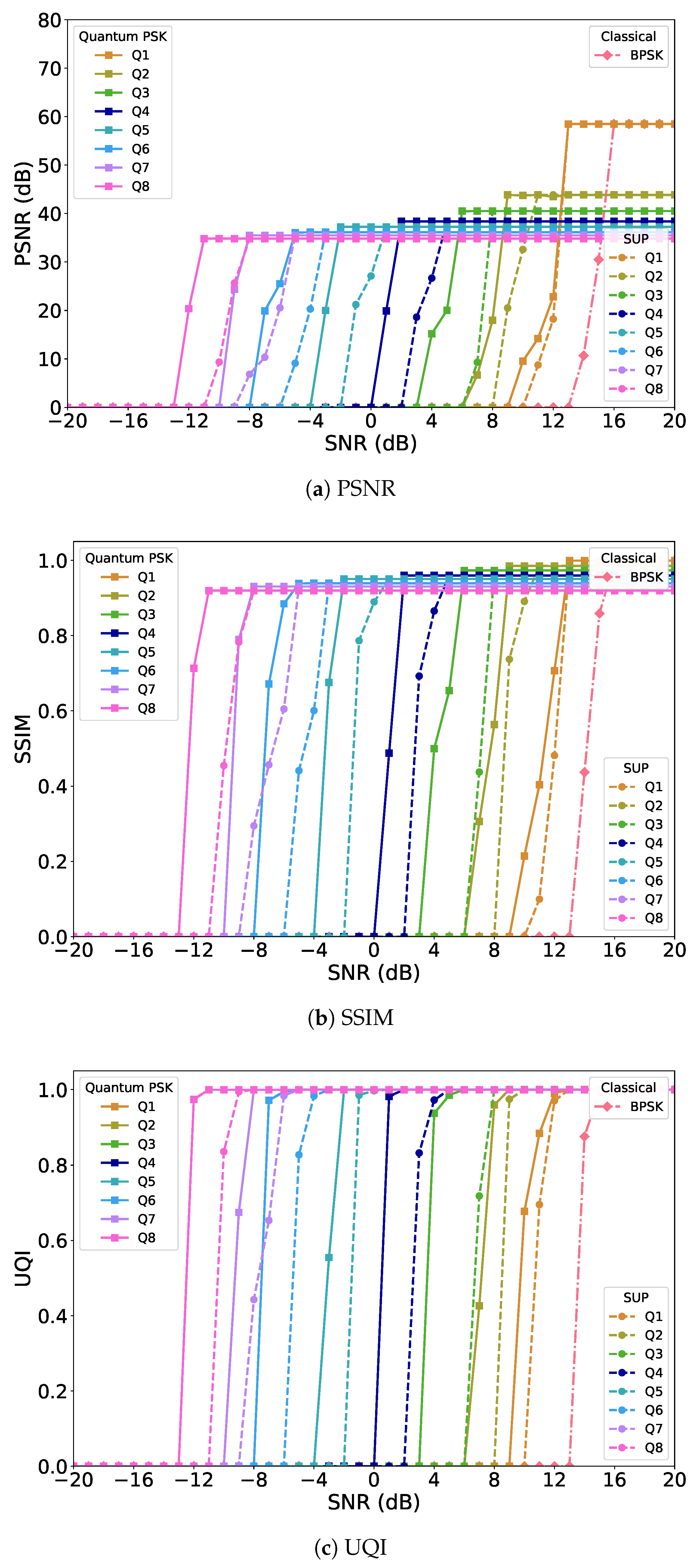 The following subsection presents the performance of the proposed method across different image formats under both uncoded and channel-coded scenarios. In all figures, solid lines with square markers denote the multi-qubit PSK system (Quantum PSK), dashed lines with circle markers denote the superposition-only (SUP) system, and dash-dot lines with diamond markers denote the classical BPSK system. For consistency, the tables also use the labels PSK to represent the multi-qubit PSK system and SUP to represent the superposition-only system. Furthermore, all results represent average values over 1000 independent simulation runs for each image across the entire dataset. The variability across runs is negligible (e.g., dB for PSNR and for SSIM/UQI). Because these fluctuations are minimal, error bars are omitted, ensuring the figures remain clear while still reflecting statistically robust trends.