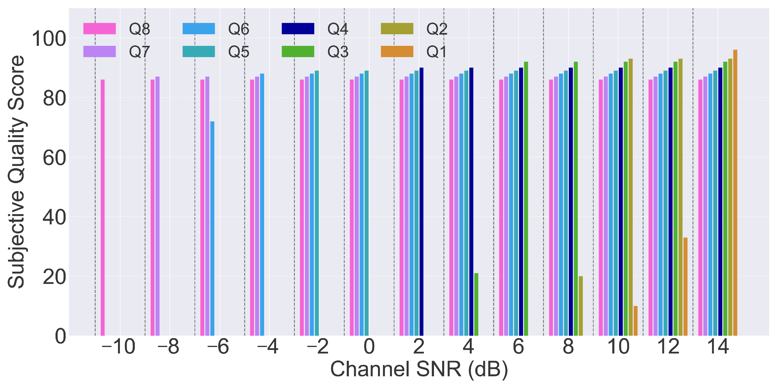 Figure 2a. As the qubit size increases, the performance of the proposed system improves, with higher PSNR values indicating better reconstruction quality. This demonstrates that the proposed multi-qubit PSK encoding effectively enhances resilience against channel noise as the encoding qubit size increases, even without channel coding. At high SNR, systems with smaller qubit sizes achieve higher peak PSNR values because the total transmission energy is concentrated over fewer states under the bandwidth normalization constraint. However, these systems are less resilient to noise at low SNR due to their limited exploitation of phase information. In contrast, the decline in maximum PSNR for larger qubit sizes results from the trade-off between noise resilience and bandwidth-constrained compression. Increasing the qubit size