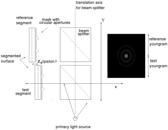 As can be observed in Equation (9), the interference term appears again for the case of inclinations the same way as in the typical case of Young’s experiment, Equation (2). Therefore if we want to generate a piston error, then it is compare the Young fringes in two adjacent segments, where the fringes for the classical Young experiment are used for the fixed segment and for the segment with piston a constant is added to variable , as it was previously mentioned.
