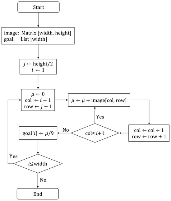 In this work, every input image used in the runs of the algorithm proposed includes Gaussian noise. Some examples of input images are shown in Section 6. Hence, before running the genetic algorithm, noise is reduced by assigning every pixel the average intensity of its neighbors and itself. After this, the intensity of each of the pixels on the first row bottom-up of the top-half, i.e., row (where h is the image height) is stored into a one-dimensional array, referred as in the fitness algorithm, the length of which is equal to the width of the input image. In the flowchart of Figure 5, the algorithm used to remove Gaussian noise from the input image is shown.