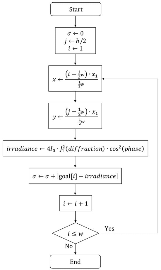 Fitness is in terms of how far or close a given solution is from a goal image given as input. The logic of the algorithm is as follows: for every point where x in , we measure the irradiance by means of the Young experiment, and then compare it with the value of . Algorithm 2 calculates the fitness of each individual (as shown in the flowchart of Figure 6); at the end of it, the fitness value will range from to .