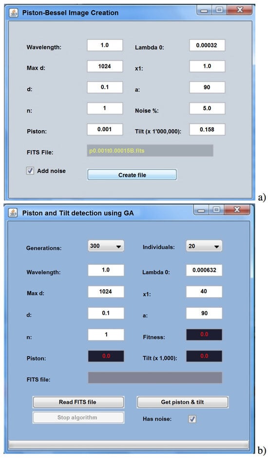 Both ranges have to be known from start since genetic algorithms perform both exploration and exploitation inside a given enclosed search space where the best solution is expected to reside. We have decided to use the range for tilt values since it is symmetric and denotes the largest possible interval free from ambiguities, which means that no two values in this range produce exactly the same patterns. Adding a constant to the first value in the range, results in the same patterns as adding such a constant to the last value. As for the piston, no ambiguities were observed because the interference fringes showed a progressive widening as the piston values varied from to 45 mm in our experiments. However, in practice, piston values range from to a few centimeters. Thus, we considered fair enough to use piston values in the range to run our simulations, taking into consideration that the lower the range, the more accurate the result.