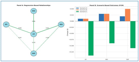 The findings of this study underscore that logistics performance, institutional quality, and sustainability indicators act as co-determinants of economic development rather than independent variables. The FCM-based simulations demonstrate that integrated improvements across these domains (as in Scenario B) generate clear gains in GDP per capita, whereas simultaneous regressions (Scenario C) create systemic vulnerabilities and output losses. These results resonate with recent empirical work highlighting that modern growth is increasingly dependent on infrastructure quality, institutional coherence, and environmental balance. As Krugman [67] emphasizes, the long-term productivity of economies hinges not only on capital and labor but also on the efficiency of networks—both physical and institutional. The scenario framework employed here validates these claims by showing how changes in one area (e.g., logistics or transparency) can cascade throughout the development system. This reinforces the need for multidimensional policy approaches that strengthen the foundations of economic performance in a post-growth global context.