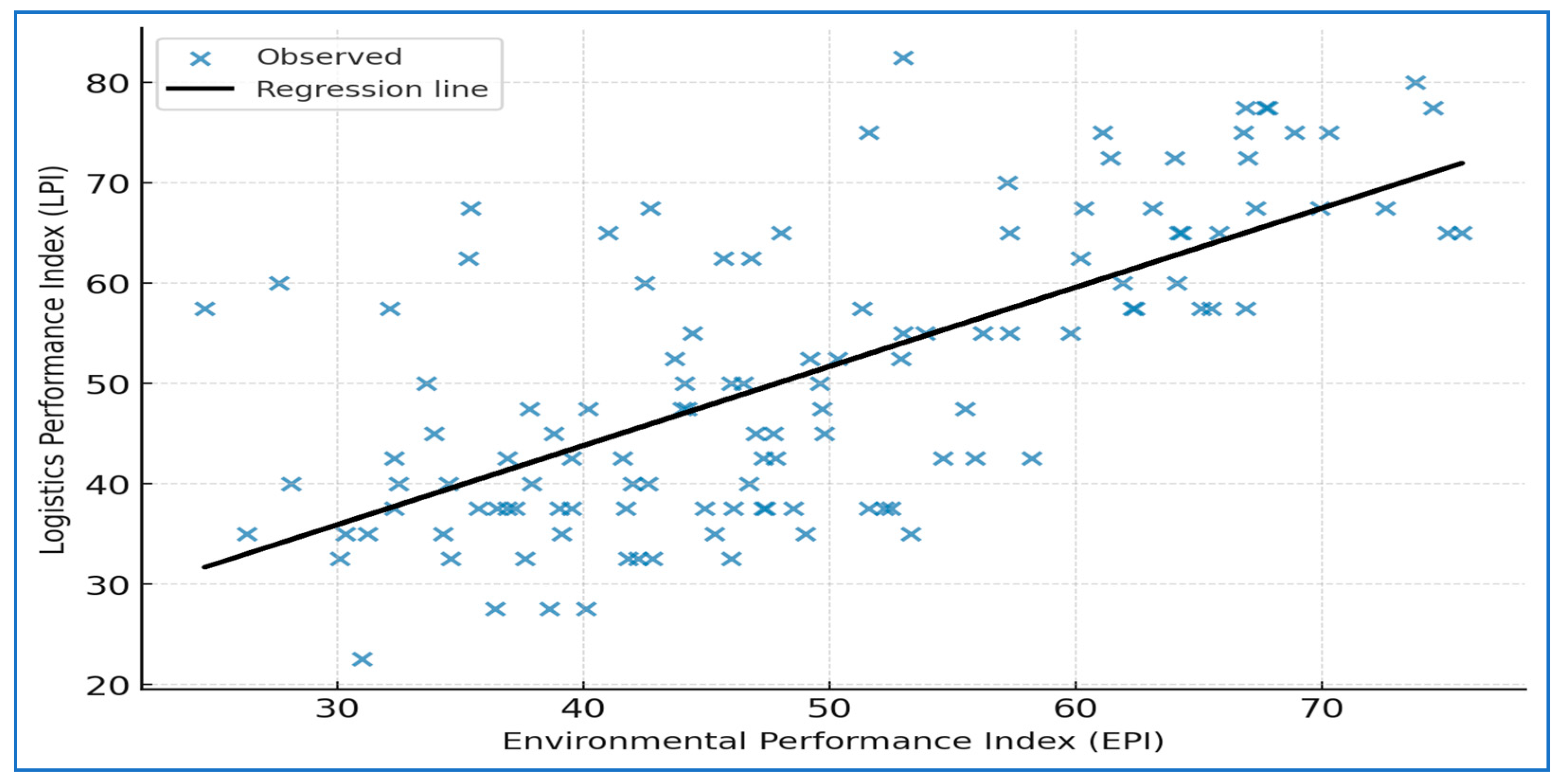Regarding RQ1 (“How do ESG-related metrics relate to logistics performance?”), three simple regression models were estimated with LPI as the dependent variable and, alternatively, EPI, SDG, or WGI as single predictors. This setup makes it possible to isolate the individual contribution of environmental sustainability, sustainable development progress, and governance quality to national logistics performance.